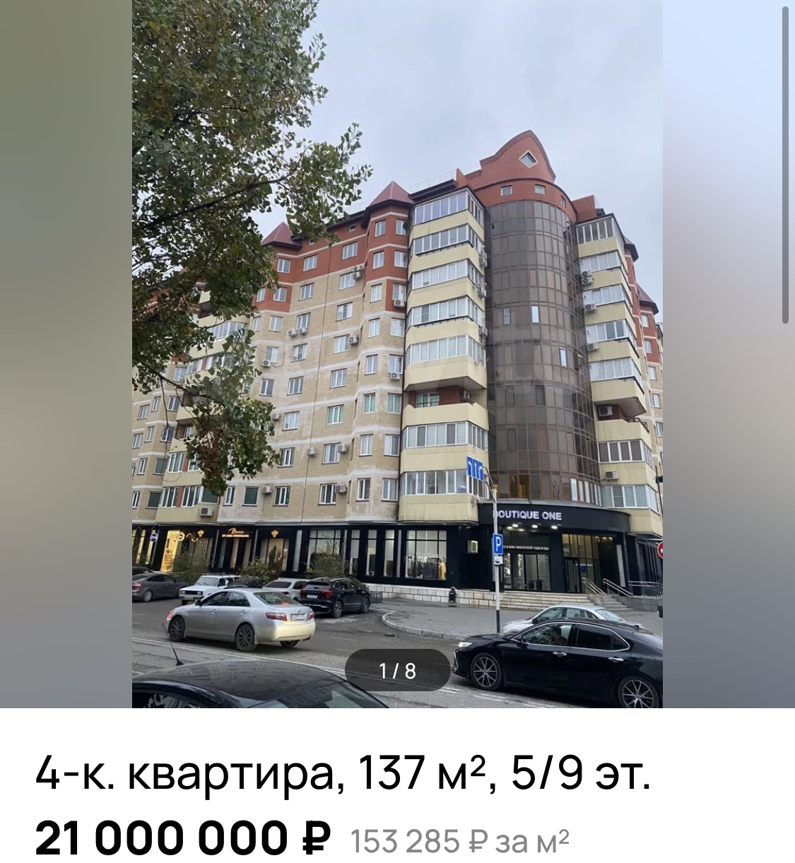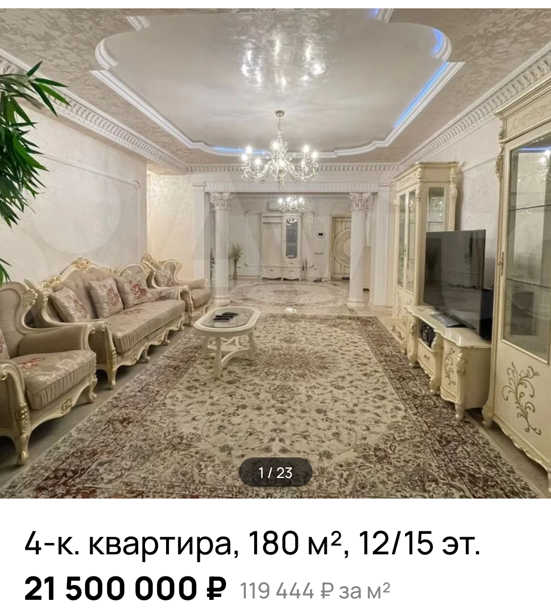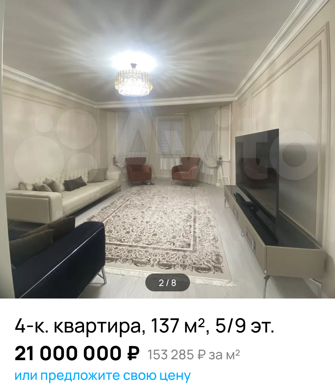 Квартира в центре Грозного, самого безопасного города России в 2023 году. Дом в центре, где много современных строений, и этот дом выглядит новым. Площадь 137 квадратов, цена 21 млн, ремонт богатый.