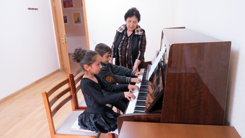 На третьем этаже сельской администрации находится музыкальная школа. Мне было интересно посмотреть своими глазами, как в такое время дети занимаются музыкой, хореографией. Узнал, что в неделю два раза преподаватели Степанакертской музыкальной школы приезжают в Ванк, где занимаются с сельскими детишками, а теперь и с теми, кто покинул свои дома.