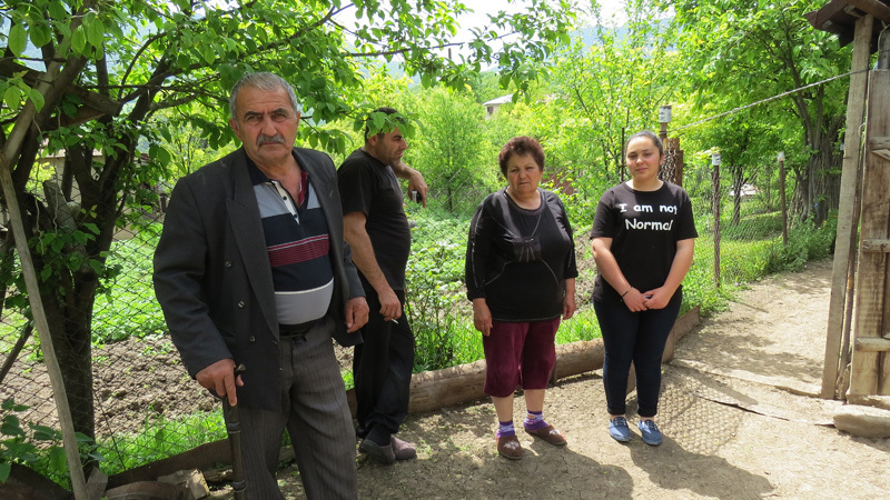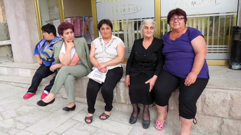 Когда выходили из дома Гриши, увидели Акопяна Алёшу стоявшего около тонира, где его супруга и внучка пекла хлеб. Старшая его дочь из Мартакерта. Во время артобстрела в начале апреля в её дом прямым попаданием попал снаряд. Внучка Марина (крайняя справа) молчала, а потом говорит: «Ждём, когда отремонтируют наш дом, чтобы вернуться обратно. Хотя у дедушки и бабушки хорошо, но хочется к себе домой».