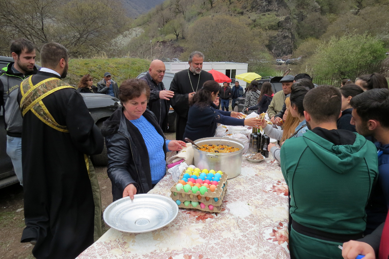 Там же, во дворе, чуть поодаль был накрыт стол для гостей, на котором были мясо жертвенного барана, пасхальные яйца, рисовый плов, сыр, зелень, рыба. Всё это освятил настоятель Дадиванкского монастыря Тер-Ованес. Люди подходили, брали свою порцию и со словами «Унтунели ини» («Да примет Господь...» отходили в сторонку...