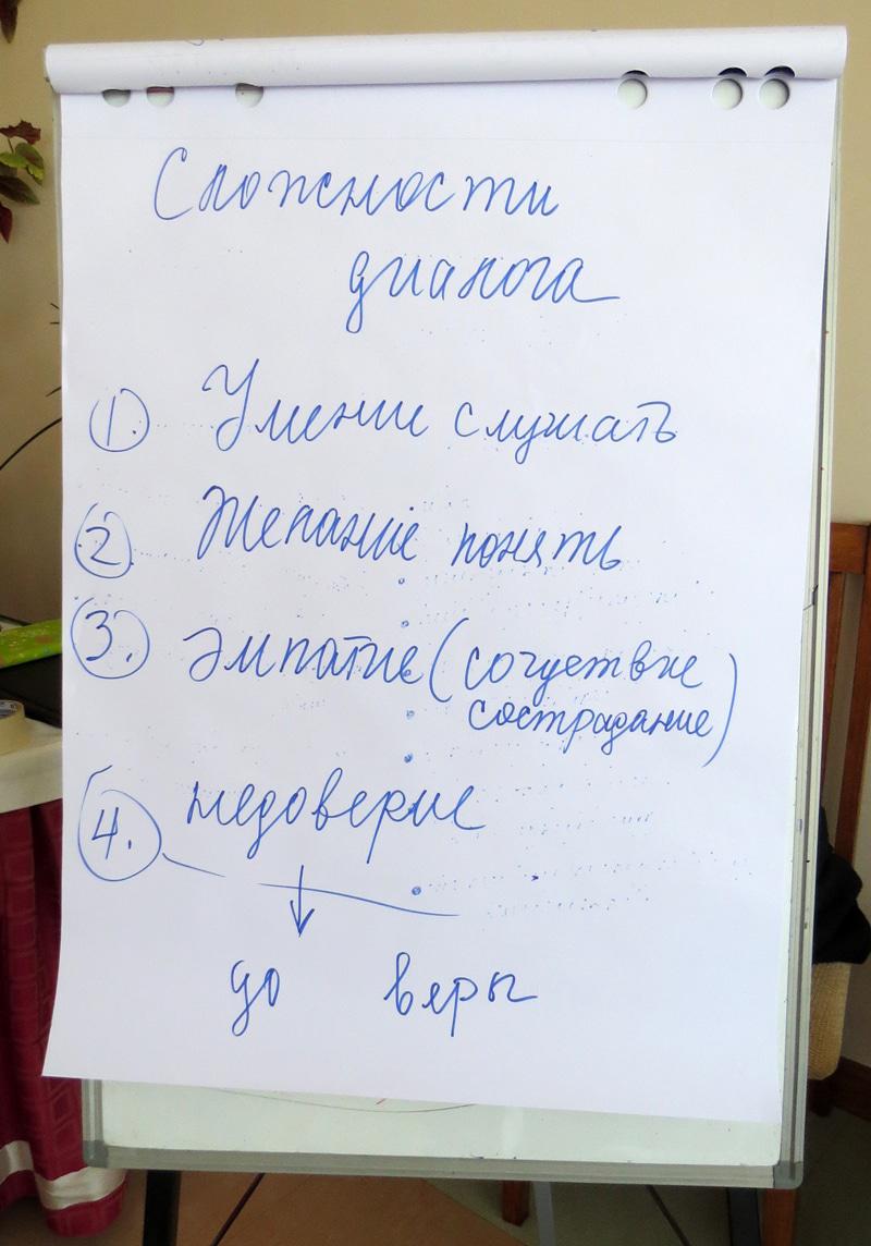 Сам диалог нужен как процесс, необходимый для продвижения мирных инициатив. Каждый участник рассказал на своём примере личный опыт разрешения бытовых, коллегиальных и иных конфликтов.