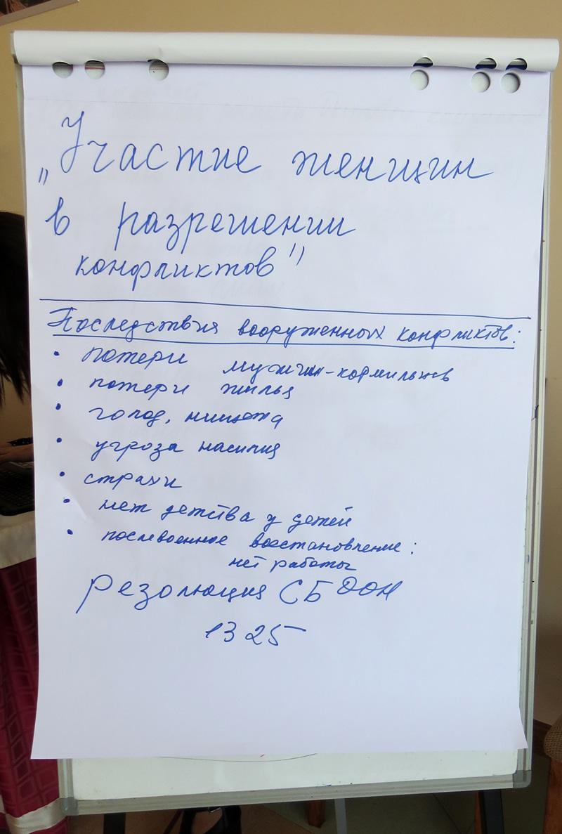 За четыре дня до начала тренинга я ознакомился с модулем, который подготовила Жанна для этого мероприятия и увидел, что большое внимание в тренинге будет уделено Резолюции Совета безопасности ООН 1325 (2000 г.), где подчеркивается важность обеспечения равноправного, всестороннего и активного участия женщин в предотвращении и урегулировании конфликтов, миротворчестве и поддержании мира.