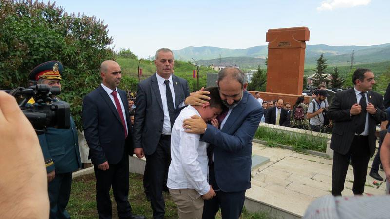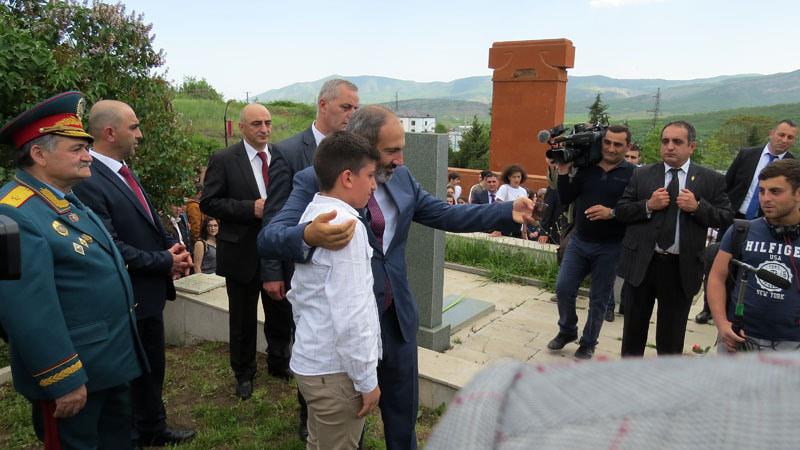 У одной из могил стоял мальчик, который, видимо, хотел сфотографироваться с ним. Но почему-то мальчик расплакался. Пашинян обнял мальчика, сделал селфи его же фотоаппаратом...
