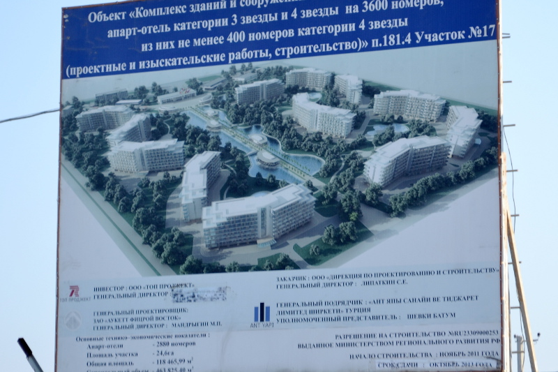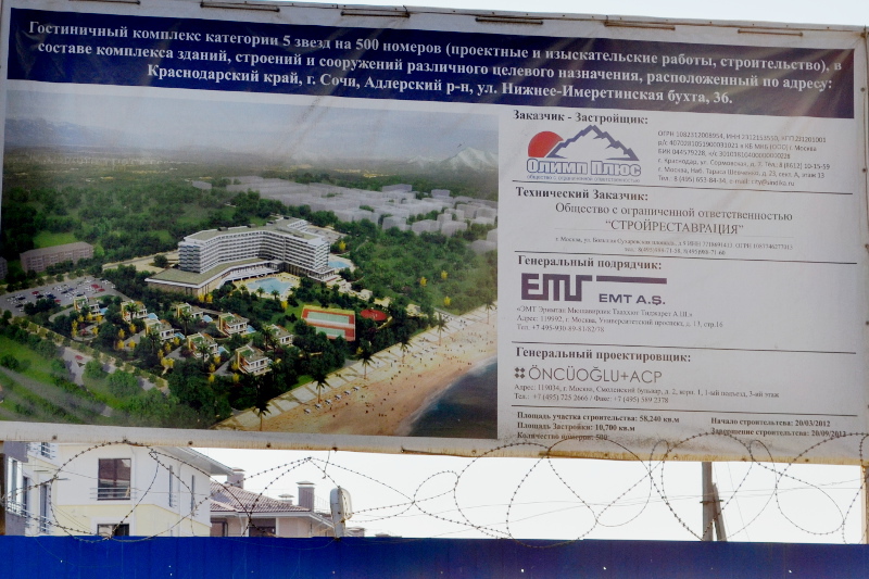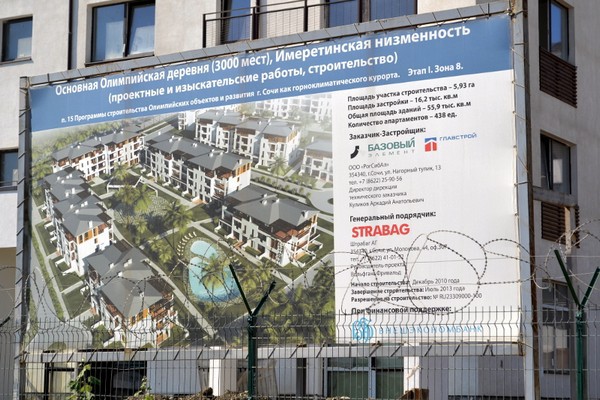 Согласно Постановлению Правительства РФ от 29 декабря 2007 г. N 991 “О Программе строительства олимпийских объектов и развития города Сочи как горноклиматического курорта” в Сочи должны быть построены 235 объектов, являющихся «олимпийскими». Корреспондент «Кавказского узла» обошла строящиеся объекты Имеретинской низменности от реки Мзымта до реки Псоу и убедилась, что строительство ведется с отставанием, на многих объектах отсутствуют паспорта строек или они спрятаны вглубь объектов за строительными заборами.
