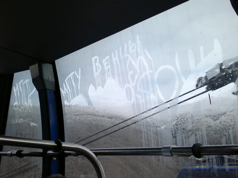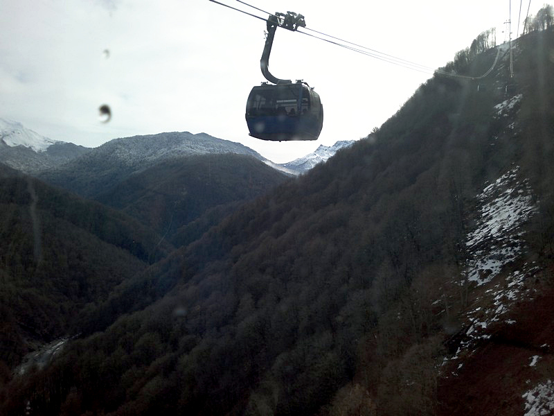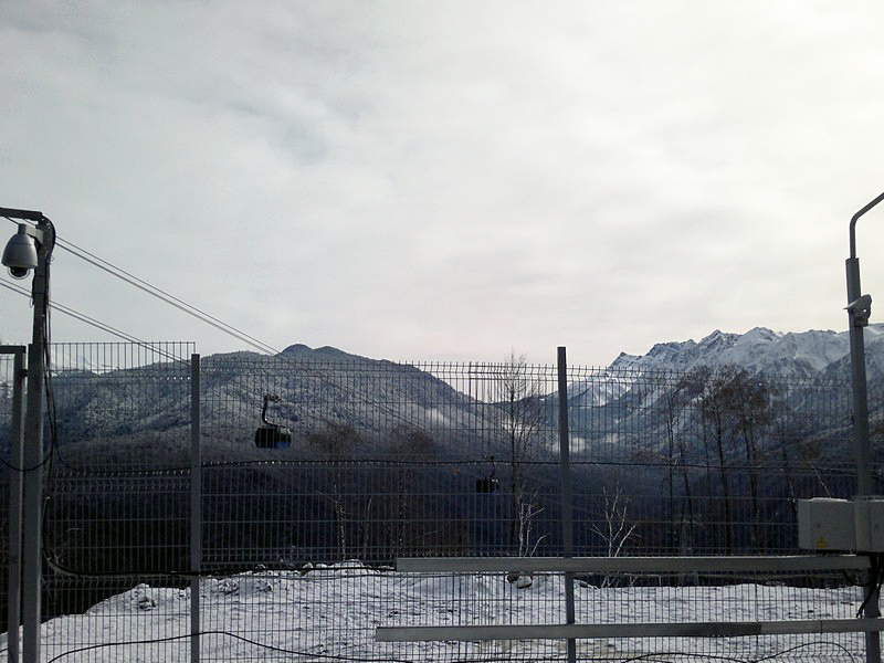 Вид из окна электропоезда «Ласточка» на участок совмещенной скоростной автомобильной и железной дороги Адлер - Красная Поляна, построенной к Олимпиаде.