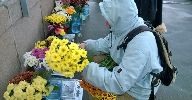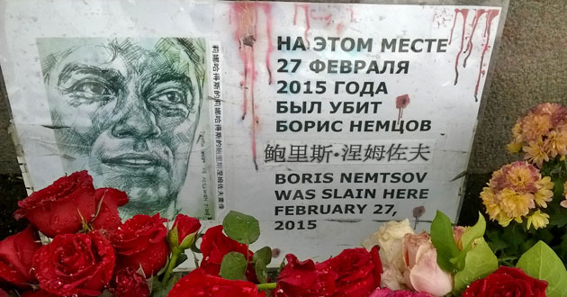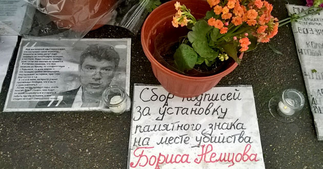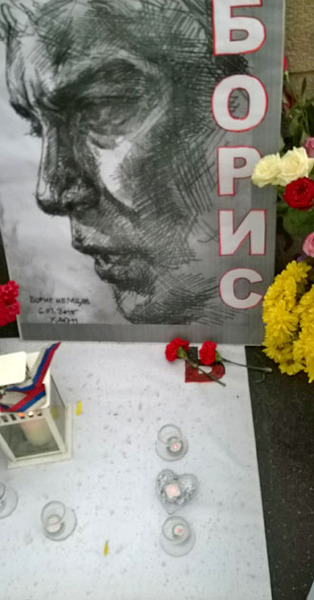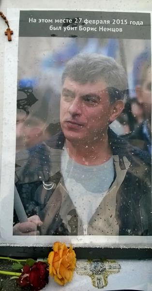 Несмотря на пасмурную погоду, весь день к месту убийства лидера оппозиции на Большой Москворецкий мост несли цветы и плакаты. «Немцов мост» – висят таблички на гранитном бордюре. «225 дней. 9.10.15» – сообщает самодельный календарь. Десятки портретов и фотографий Бориса Немцова стоят у бордюра или лежат на тротуаре моста. Возле них горят свечи, стоят сотни цветов.