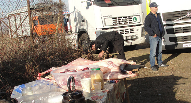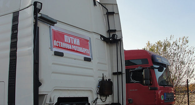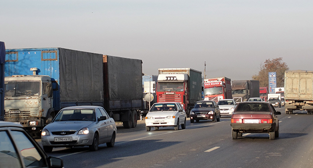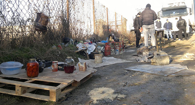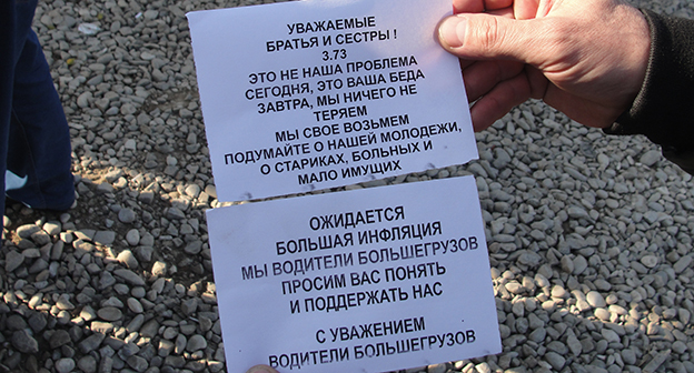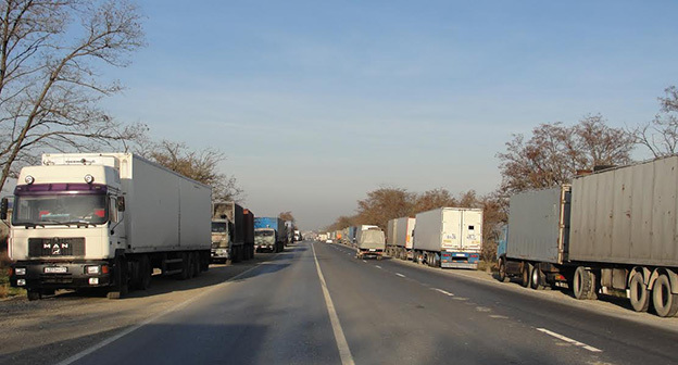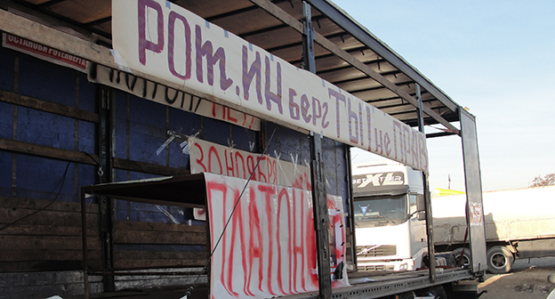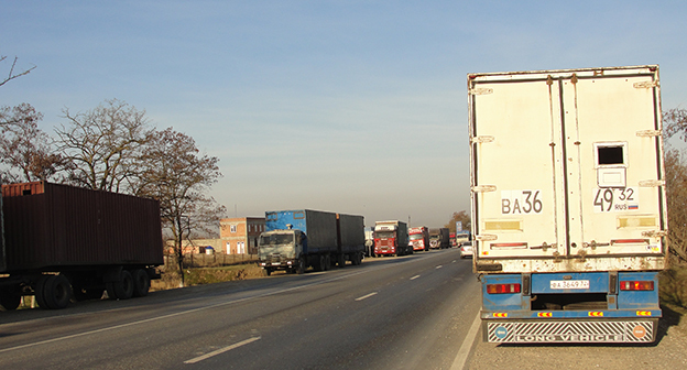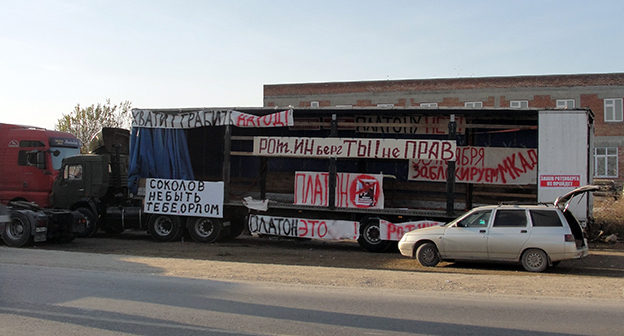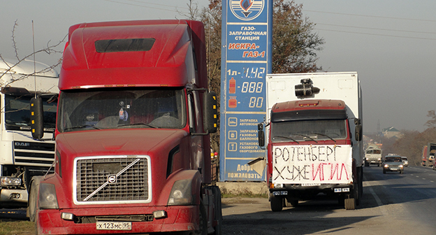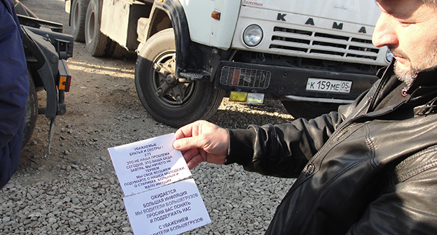 Федеральная трасса "Кавказ" между Хасавюртом и Тотурбийкалой. Бастующие водители большегрузов выстроились вдоль дороги, протестуя против системы взимания платы "Платон". 24 ноября 2015 года. Фоторепортаж корреспондента "Кавказского узла" Мурада Мурадова