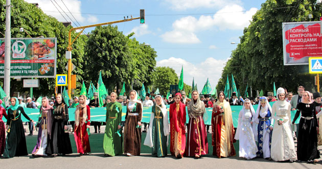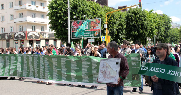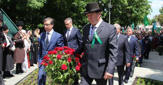 Участники памятных мероприятий возле памятника "Адыгам, жертвам политических событий 1753-1864 годов" в Кабардино-Балкарии.