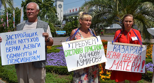 7 августа пострадавшие от действий и бездействий приставов провели в Сочи пикет. На акцию вышло около 30 человек с требованием к властям и надзорному ведомству проверить работу судебных приставов в Сочи.