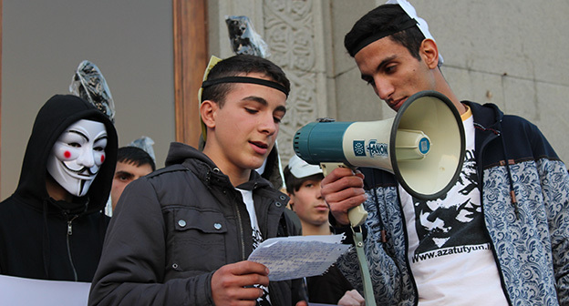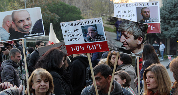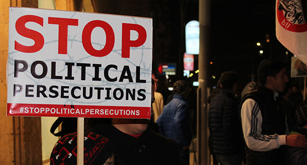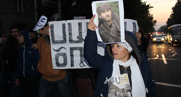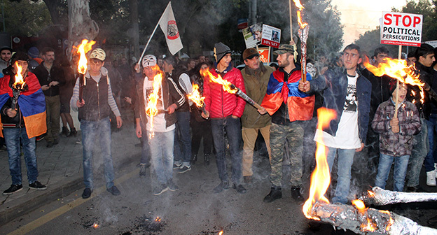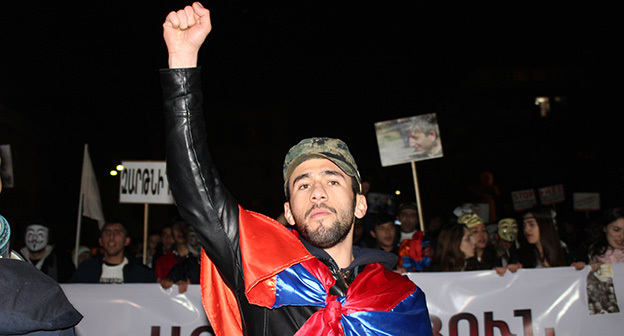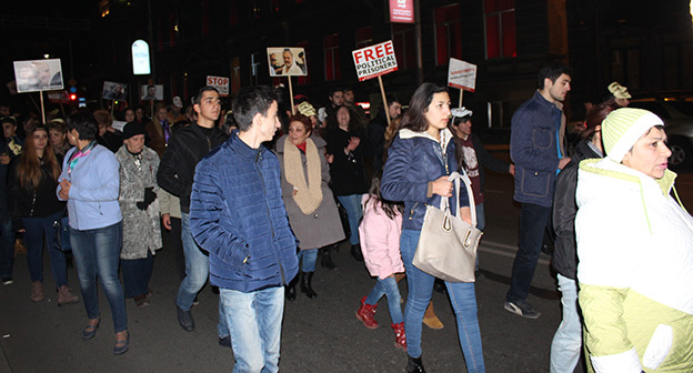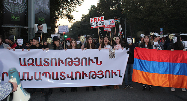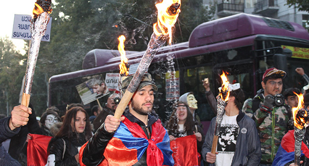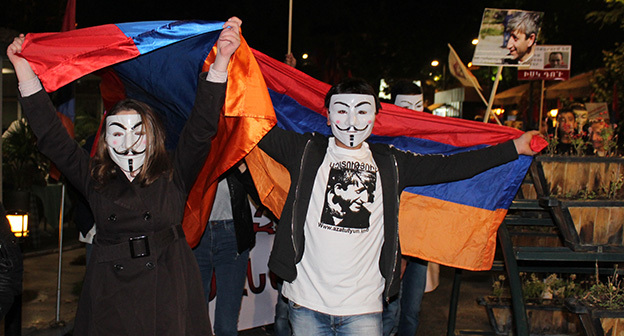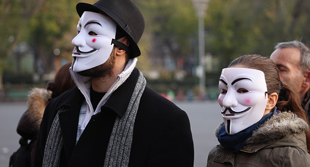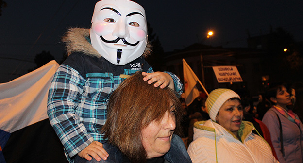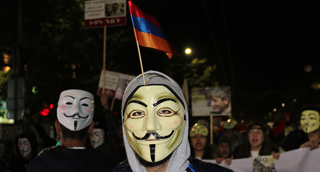 “Серж – уходи!”, “Мы – хозяева страны!”, “Продажный КГБ!” – такие лозунги красовались на транспарантах и звучали из толпы демонстрантов на улицах Еревана в третью годовщину “Марша миллиона масок”. 5 ноября около 300 человек – многие в так называемых масках Гая Фокса, некоторые с факелами – протестовали против политических репрессий. В отличие от 2013 года в этот раз обошлось без массовых потасовок с полицией. После компромиссной беседы с силовиками факелы символично тушили из огнетушителей, а в небо запускали воздушные шары. Наглядно – в фоторепортаже корреспондента “Кавказского узла”.