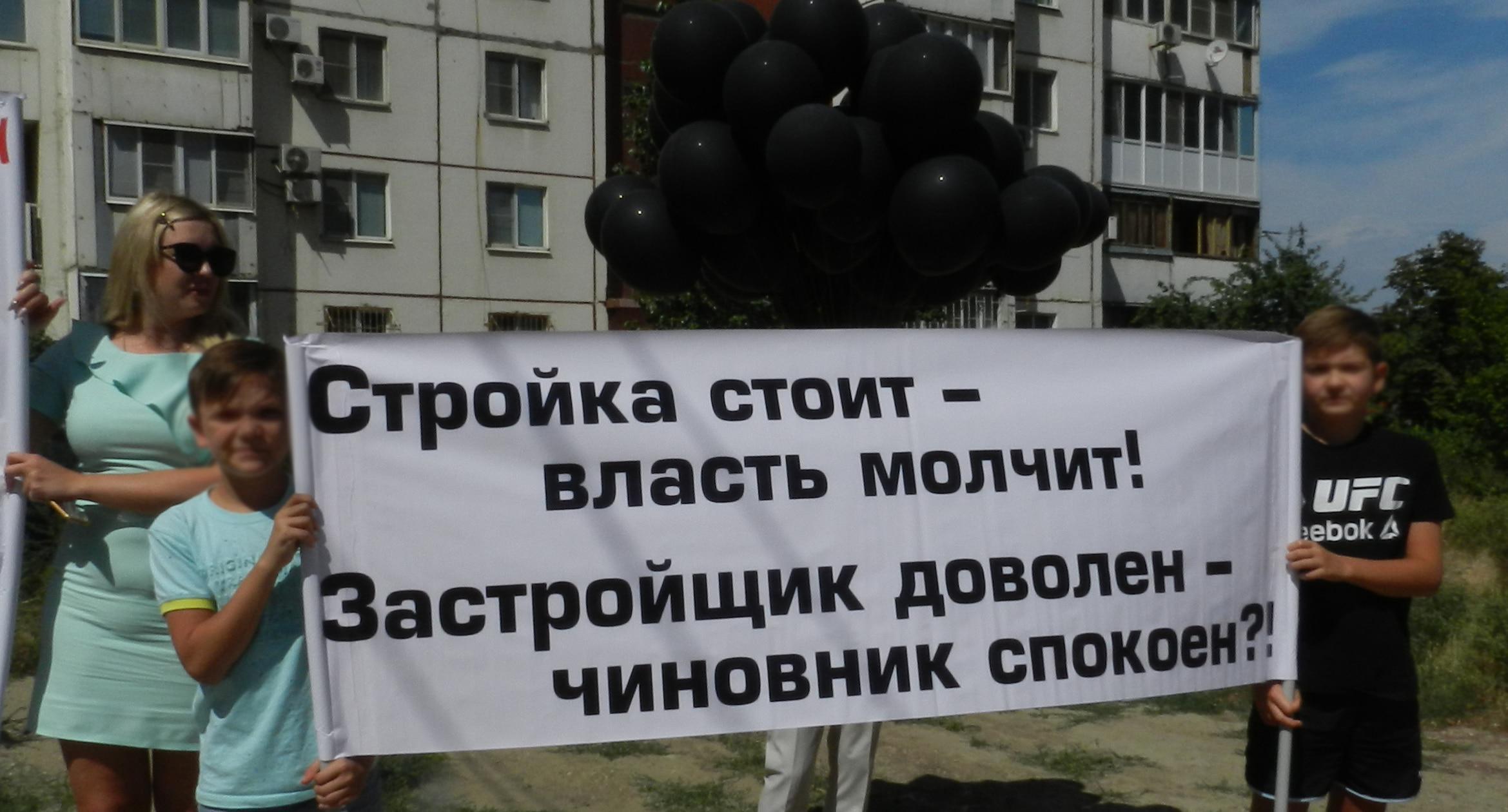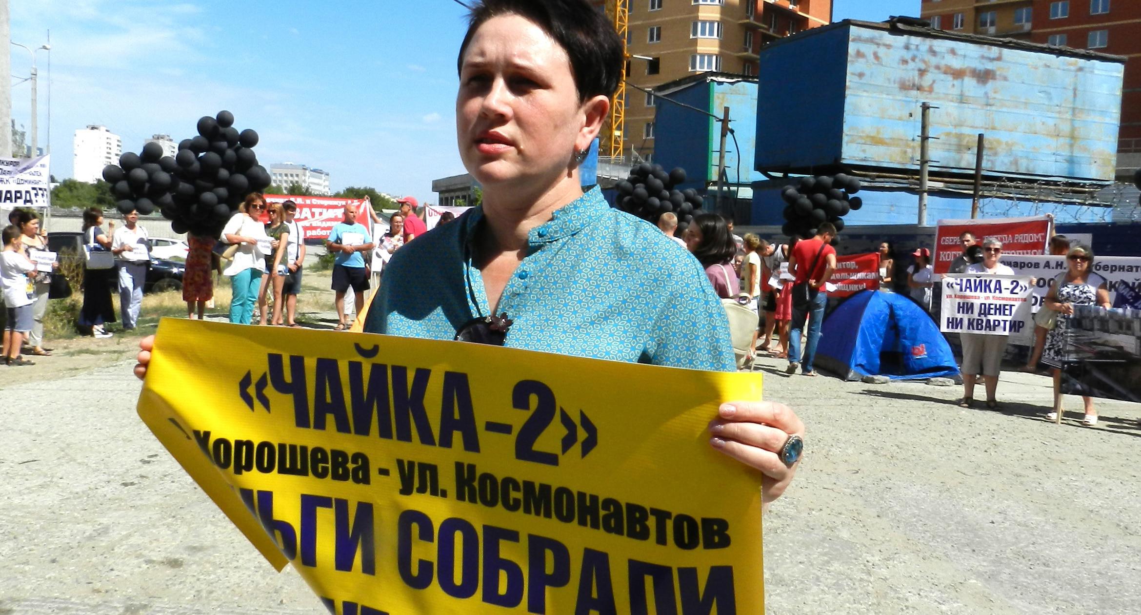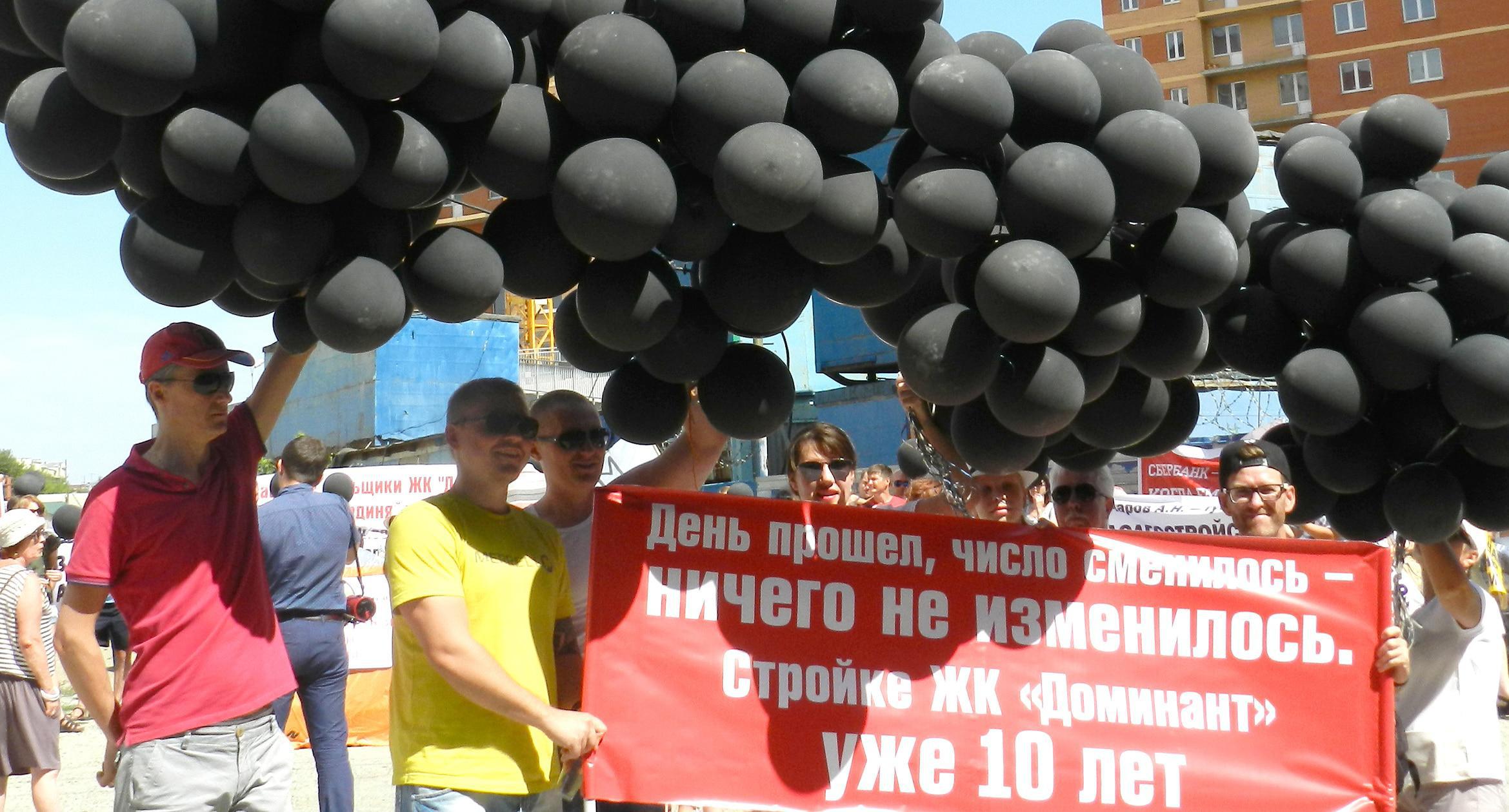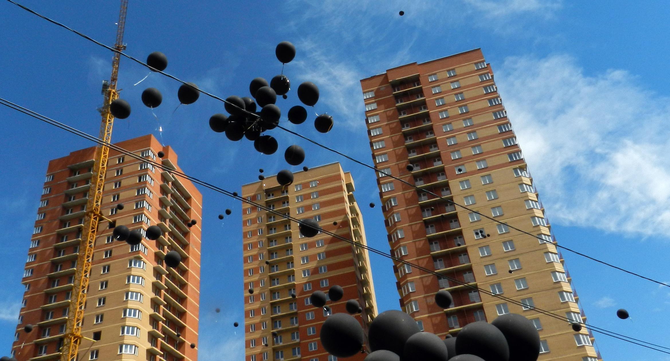 305 черных воздушных шаров запустили в небо обманутые дольщики волгоградского ЖК «Доминант» – именно столько семей вложили деньги в строительство, которое ведется уже 10 лет. В знак протеста против бездействия властей дольщики установили три палатки, показывая, что ожидать свои квартиры они вынуждены буквально в палаточных условиях. В свою очередь дольщики ЖК «Парк Европейский», собравшиеся на митинг у офиса застройщика, принесли с собой банку красной краски и написали на заборе «Путин, помоги обманутым дольщикам!». О том, как на улицах Волгограда собственники недостроенных квартир добиваются своего жилья, фоторепортаж корреспондента “Кавказского узла” Татьяны Филимоновой с митингов 20 августа.