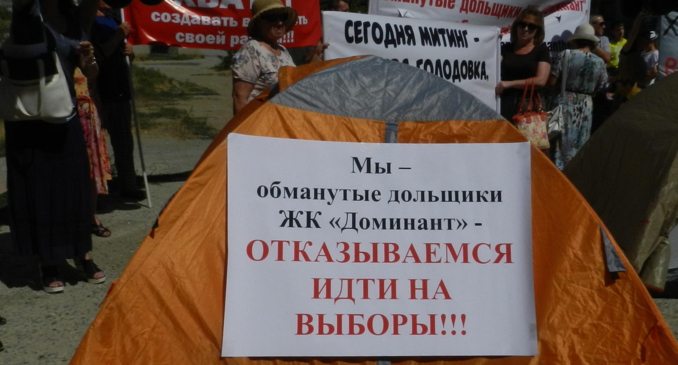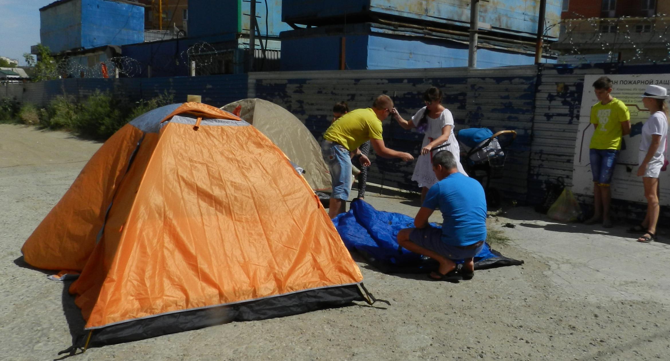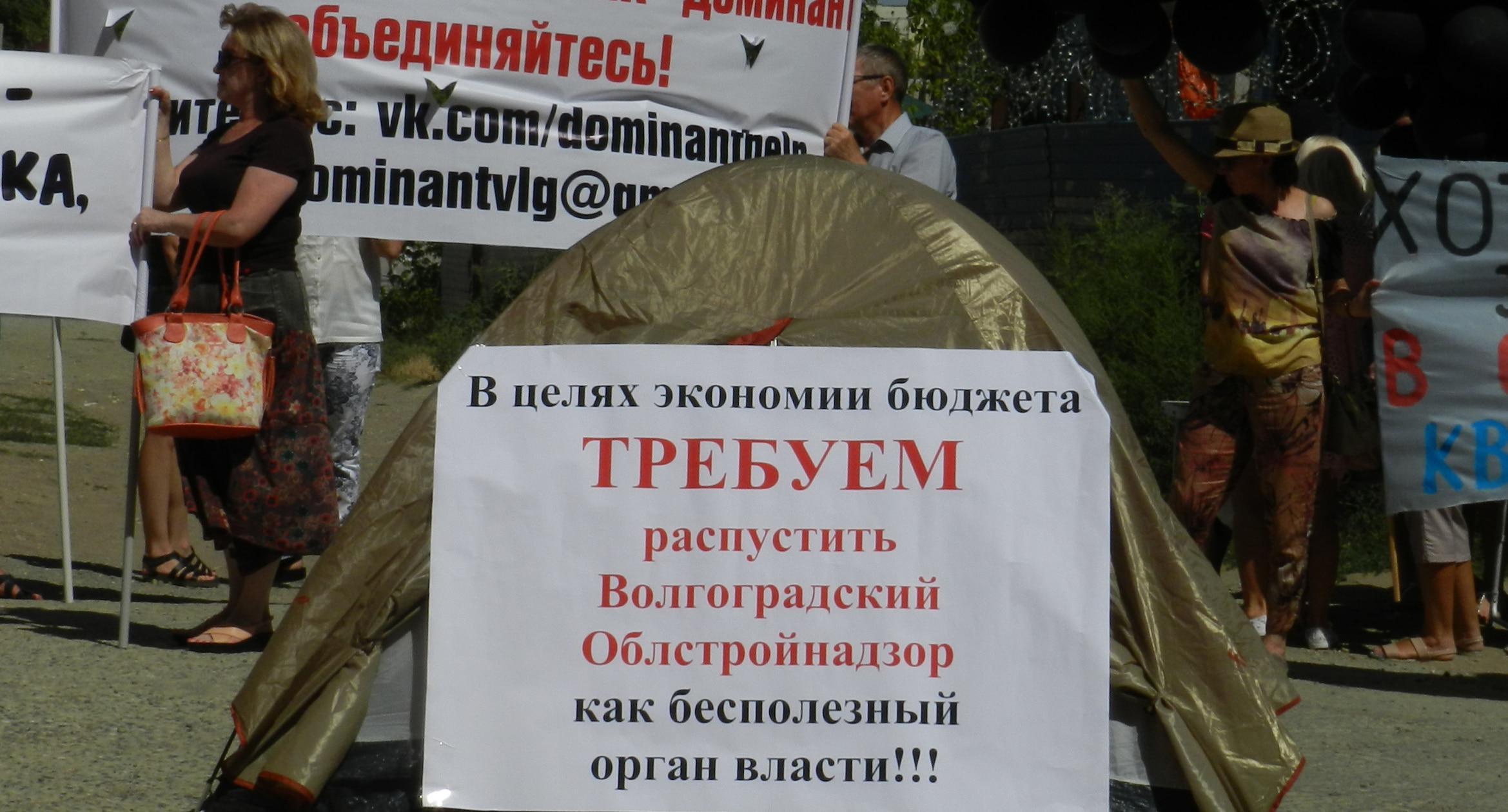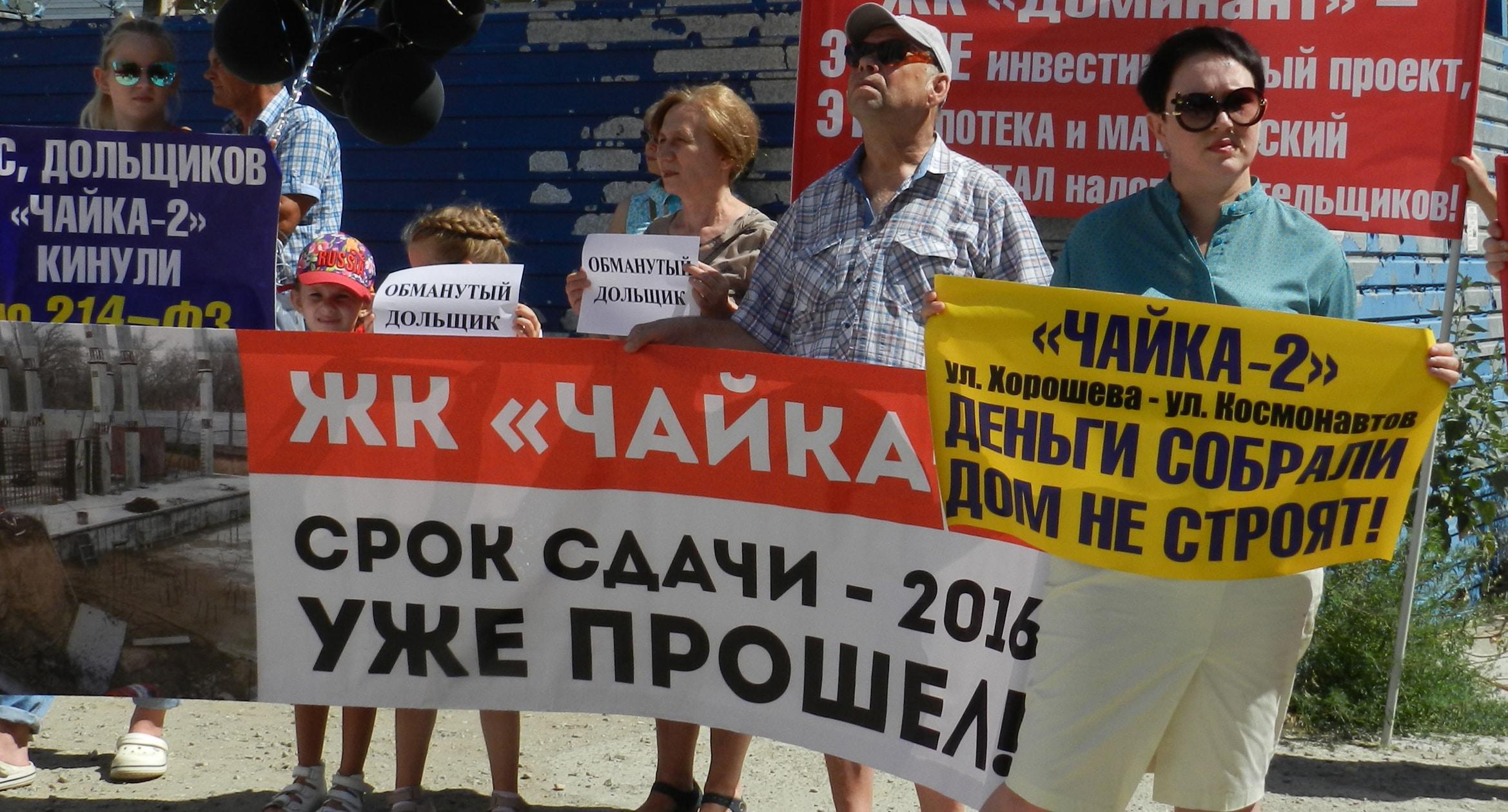 305 черных воздушных шаров запустили в небо обманутые дольщики волгоградского ЖК «Доминант» – именно столько семей вложили деньги в строительство, которое ведется уже 10 лет. В знак протеста против бездействия властей дольщики установили три палатки, показывая, что ожидать свои квартиры они вынуждены буквально в палаточных условиях. В свою очередь дольщики ЖК «Парк Европейский», собравшиеся на митинг у офиса застройщика, принесли с собой банку красной краски и написали на заборе «Путин, помоги обманутым дольщикам!». О том, как на улицах Волгограда собственники недостроенных квартир добиваются своего жилья, фоторепортаж корреспондента “Кавказского узла” Татьяны Филимоновой с митингов 20 августа.