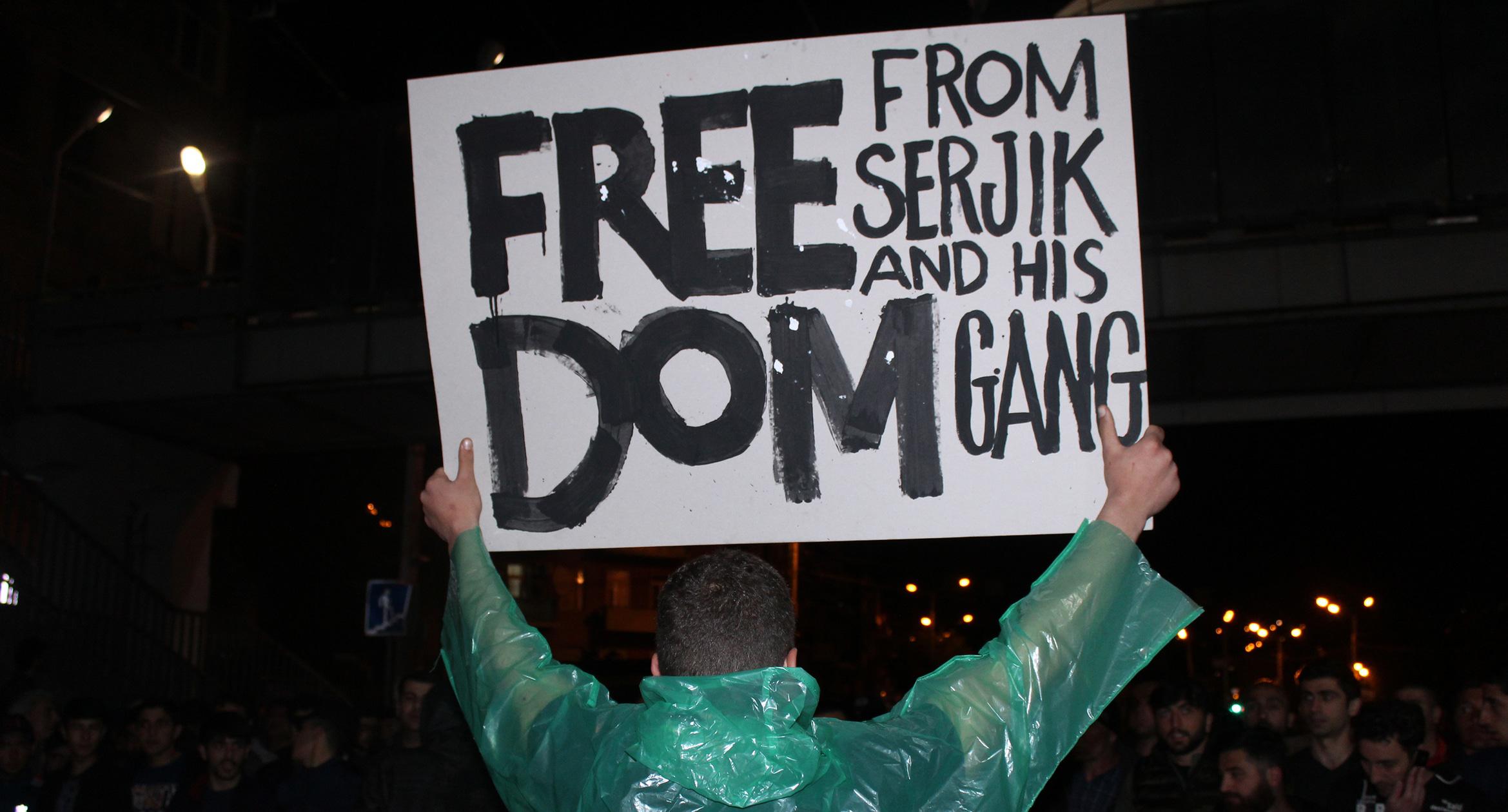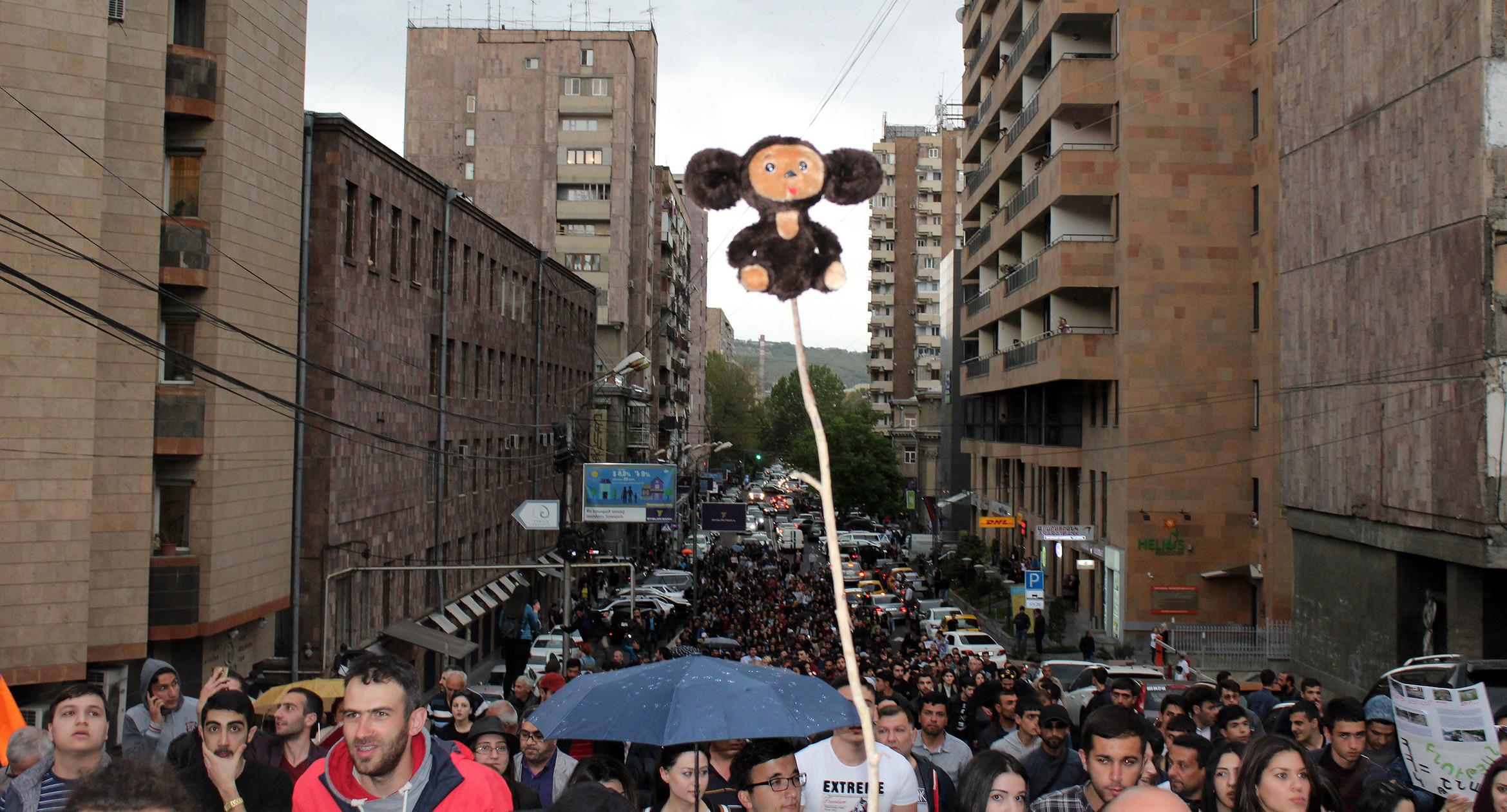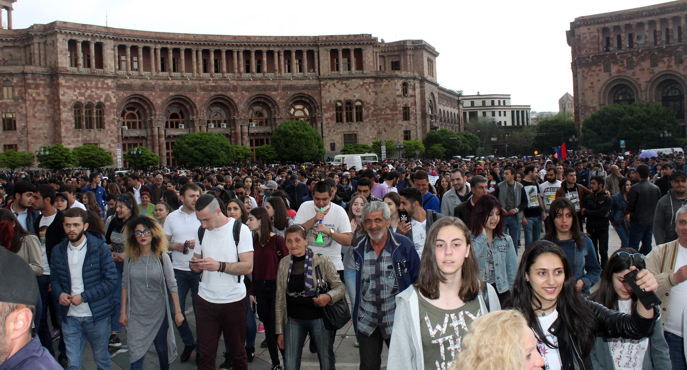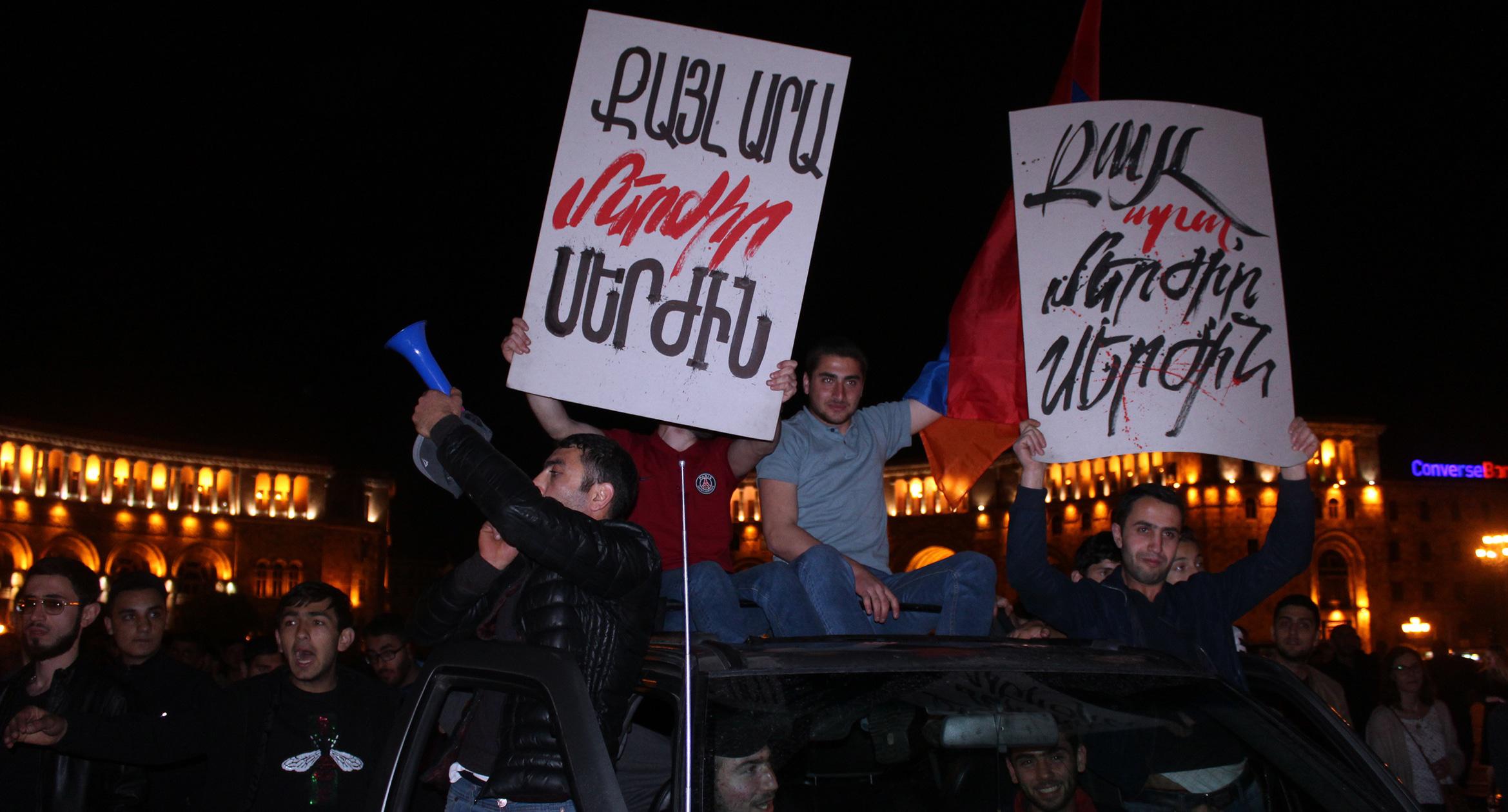 19 апреля в Ереване звучали угрозы силового разгона протестующих, а также взаимные обвинения в провокациях из уст власти и активистов. Более 120 участников акций протеста были задержаны. Активисты вновь организовали уличное шествие, перекрывали улицы и останавливали транспорт. Они призвали прохожих присоединиться к протесту против сохранения власти Сержа Саргсяна. Активисты скандировали: “Против Сержа – посигналь”, обращаясь за поддержкой водителей на ереванских дорогах. Фоторепортаж Тиграна Петросяна для “Кавказского узла”