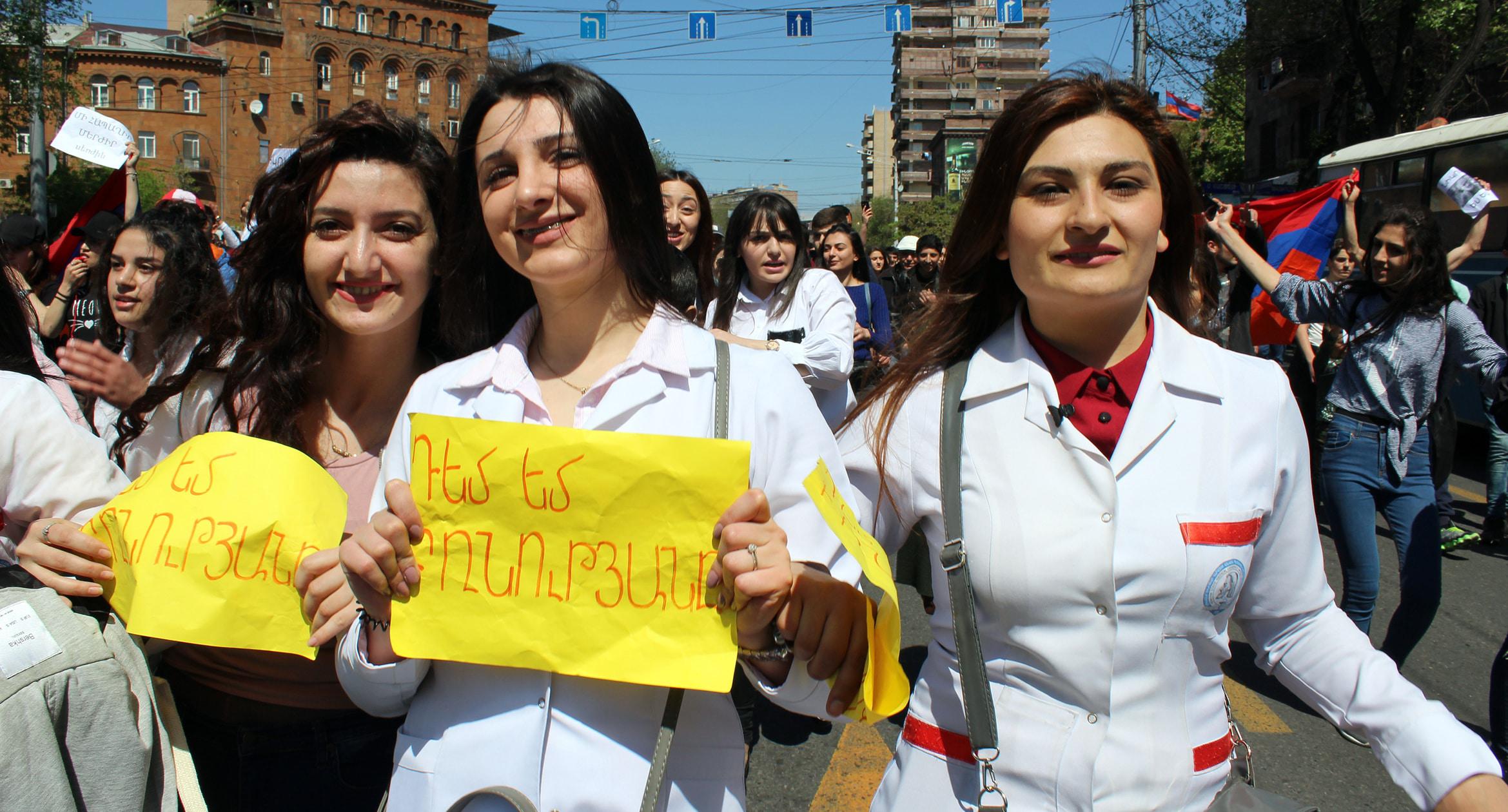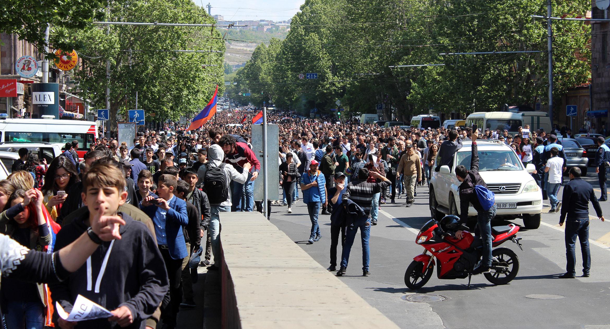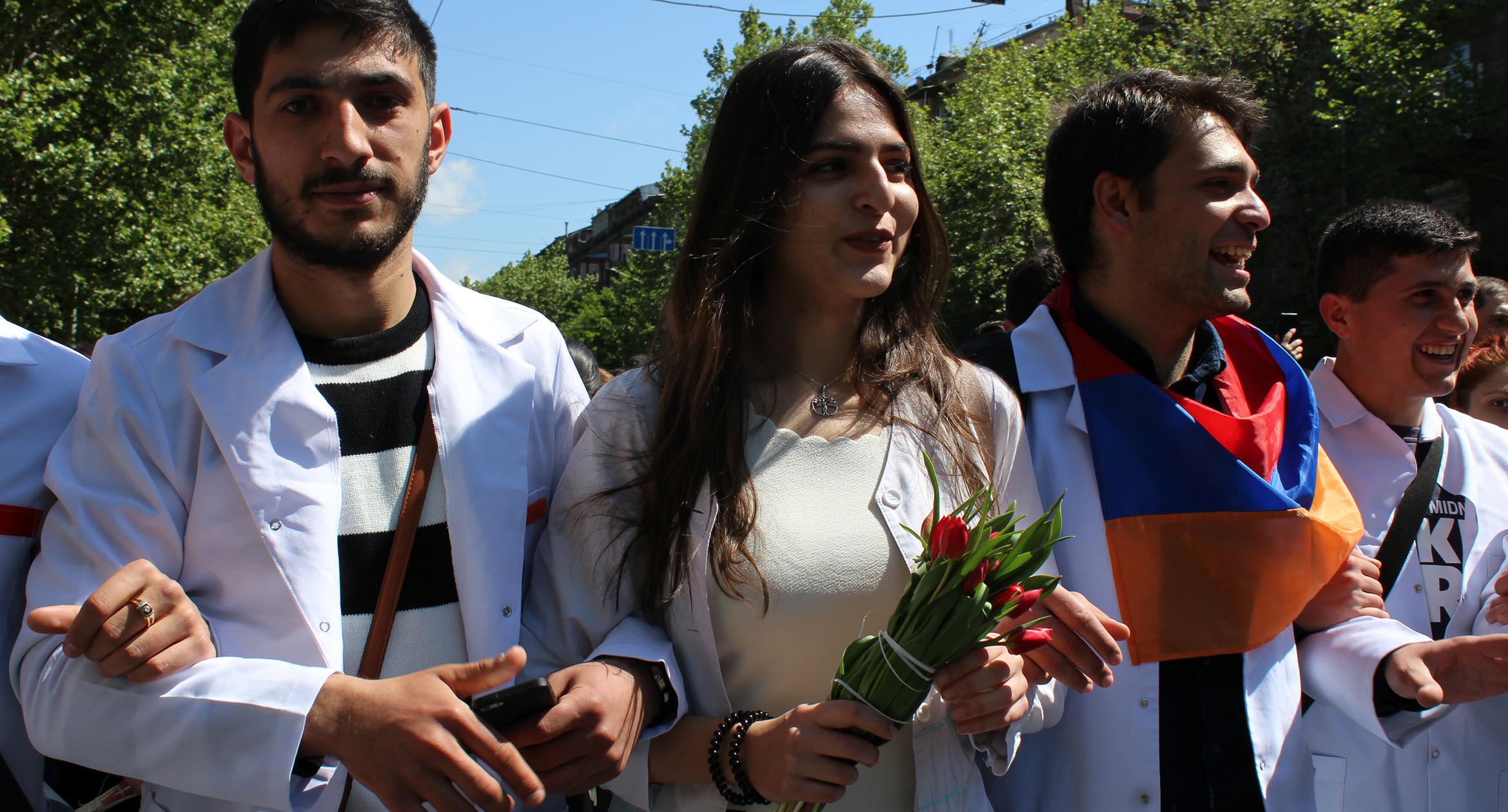 Студенты ереванских вузов 23 апреля начали забастовку. Они провели шествие по столичным улицам, призывая преподавателей присоединиться к акции. Студенты Медуниверситета шли в белых халатах и медицинских масках. Учащиеся Политехнического университета перекрывали улицу Теряна, что полностью парализовало автомобильное движение. К студентам присоединились около 20 солдат миротворческого подразделения. Организаторы шествия оценило число его участников в 10 тысяч человек. Фоторепортаж корреспондента “Кавказского узла” Тиграна Петросяна