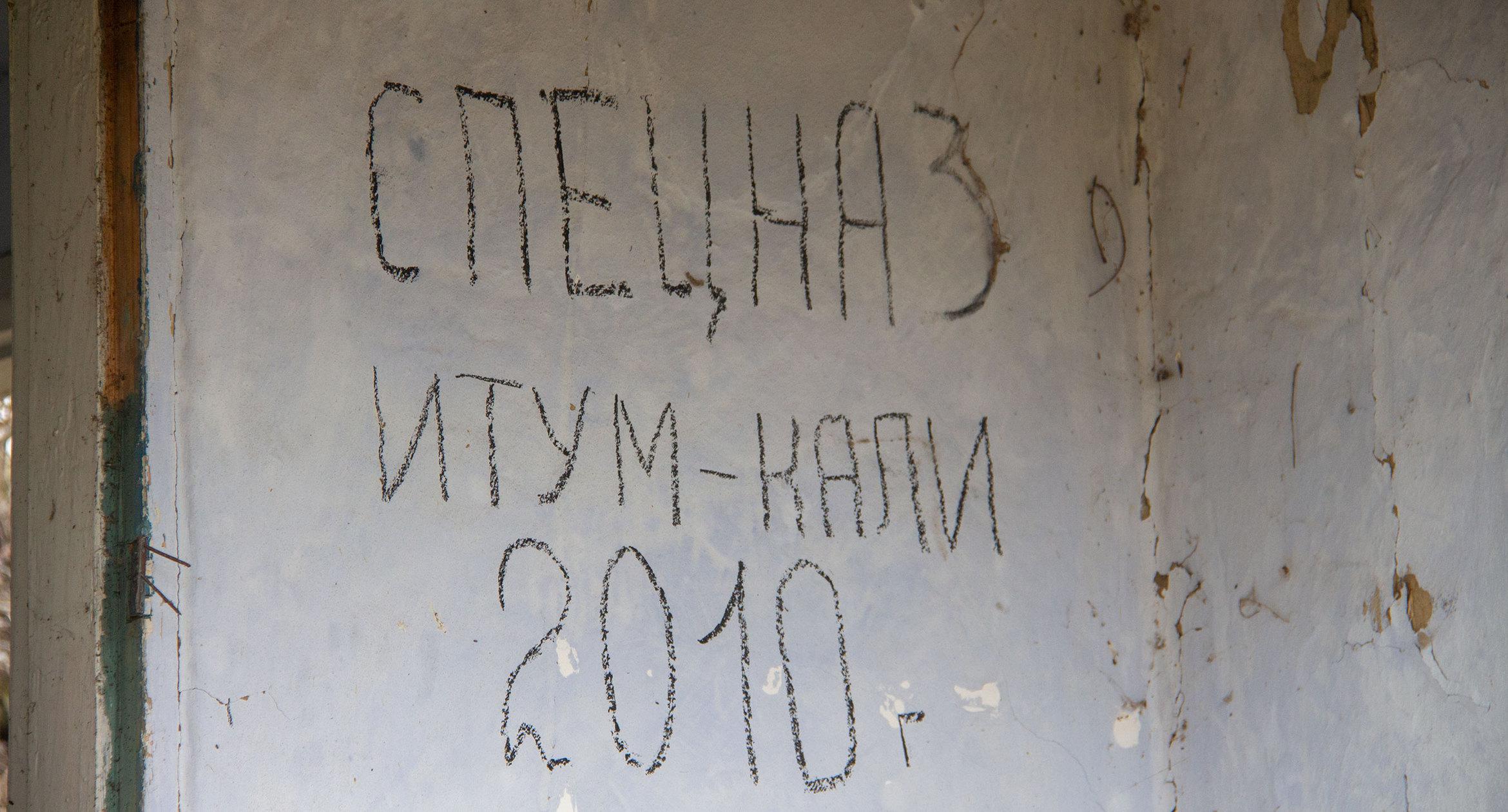 Непосредственно у въезда в село был оборудован блок-пост. Силовики покинули его всего несколько дней назад. Военные оставили многочисленные свидетельства своего пребывания. На стенах внутри домов можно увидеть сделанные краской или углем надписи вроде «Спецназ-2010, Итум-Кали».
