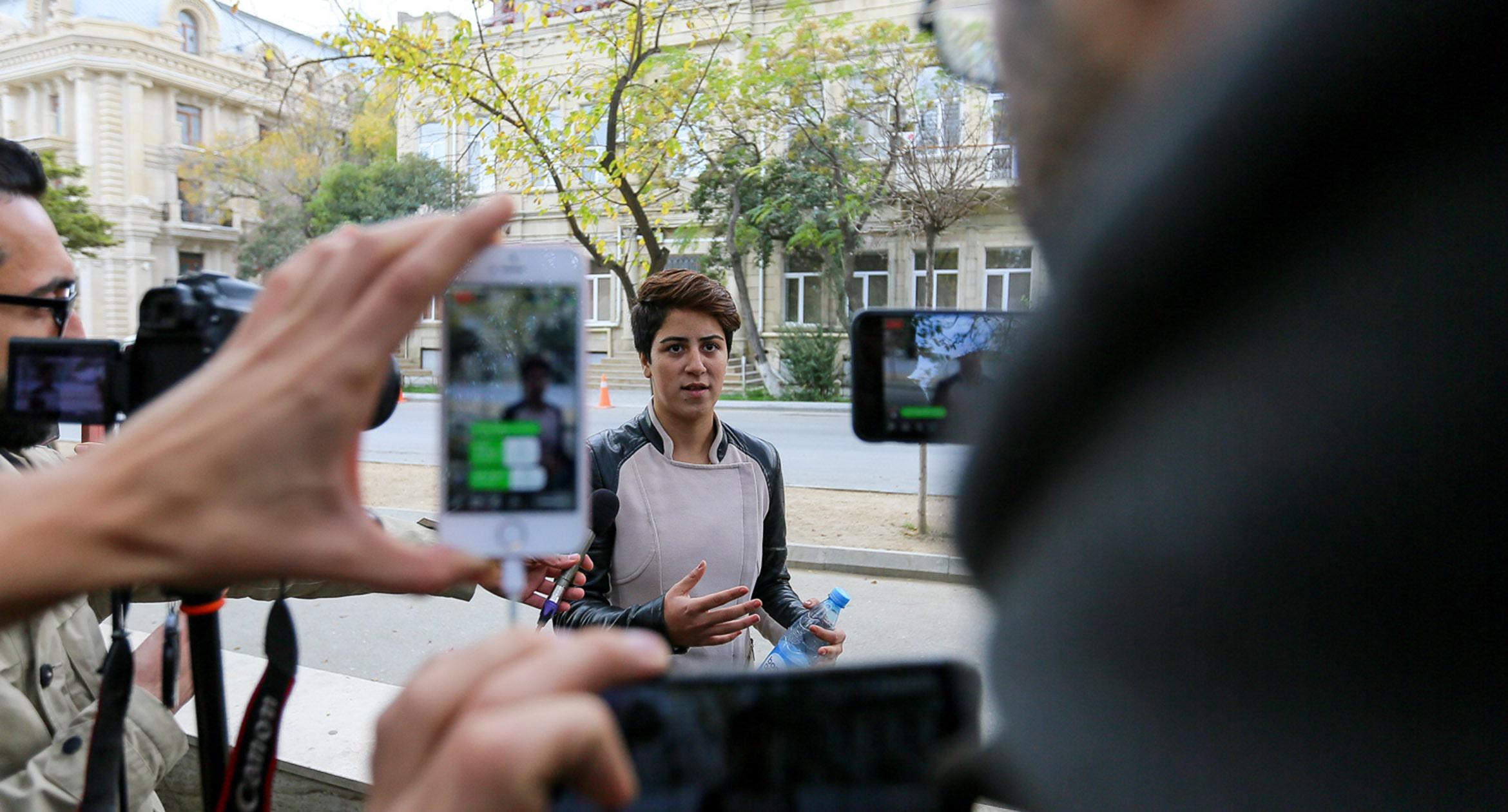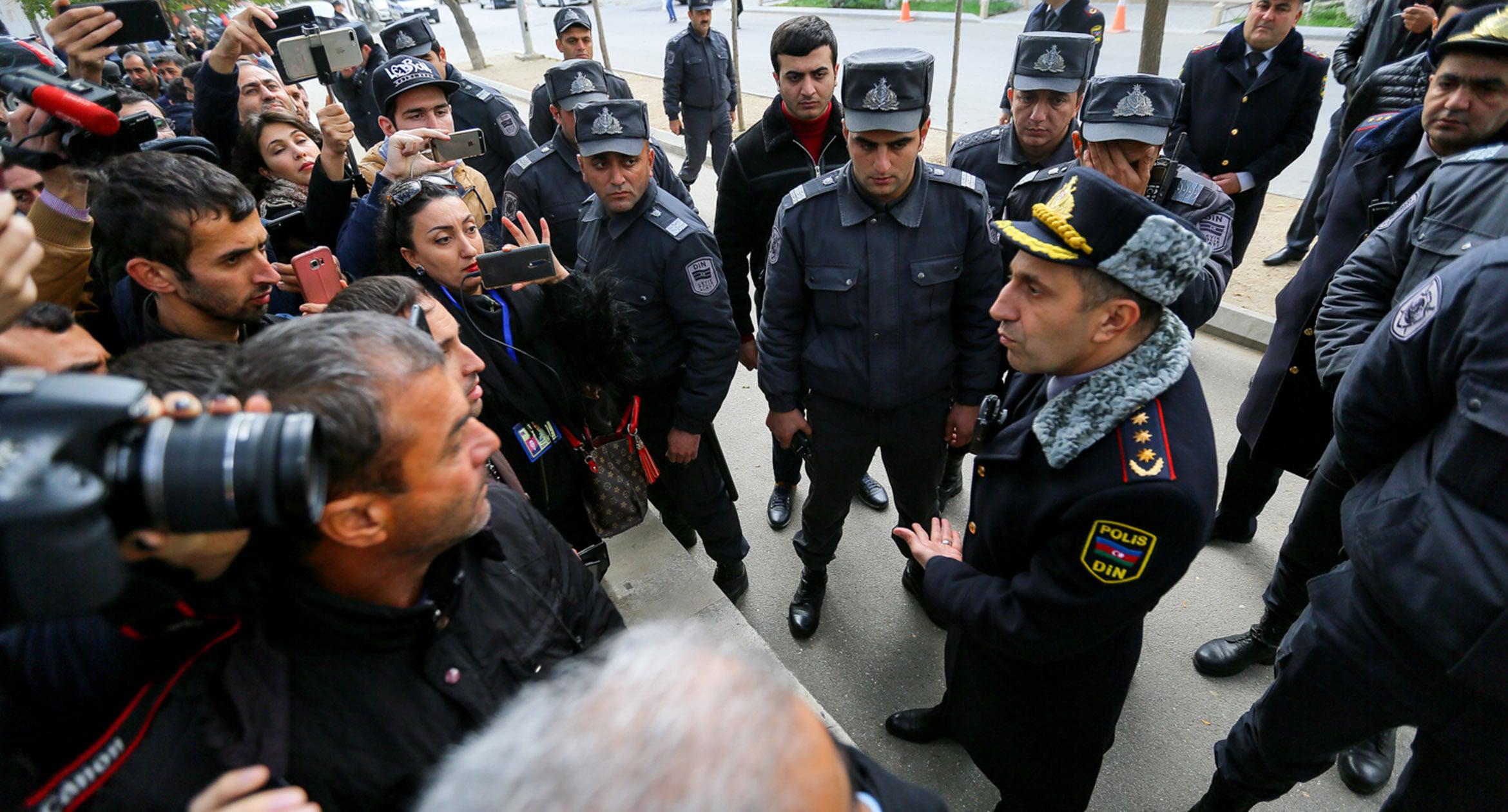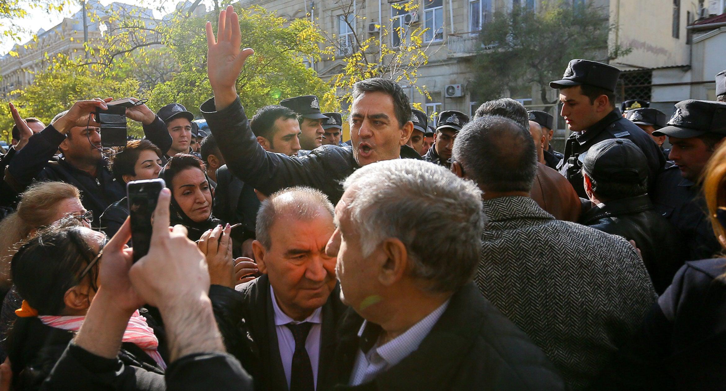 В Баку 17 ноября по случаю Дня национального возрождения оппозиция организовала шествие. Однако провести его мирно не удалось: полиция жестко пресекла акцию. В числе задержанных оказались более 50 человек, среди них лидер партии Народного фронта Азербайджана Али Керимли и глава Нацсовета демократических сил Азербайджана Джамиль Гасанли. Такая реакция властей побудила еще одну акцию: вечером того же дня около 100 активистов собрались у здания Сабаильского районного управления полиции, требуя освободить задержанных. Участников стихийной акции силовики принудительно посадили в автобус и вывезли примерно на два километра от места проведения акции, после чего отпустили. После этого были освобождены около 40 активистов, задержанных во время шествия. 11 человек вместе с Керимли были обвинены в нарушении правил массовых акций. 19 ноября трое участников оппозиционного шествия были арестованы судом на 20 суток, остальные, включая Али Керимли, – оштрафованы. О том, как встречали освобожденных активистов их соратники, фоторепортаж корреспондента «Кавказского узла» Азиза Каримова.