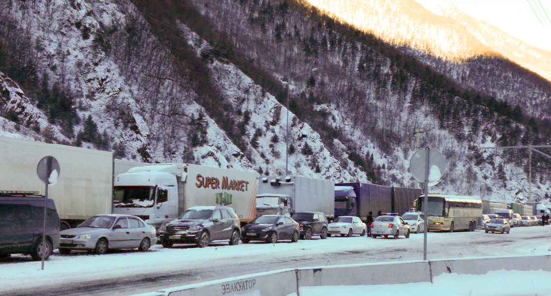 Водители около 200 транспортных средств оказались в плену у непогоды на границе России и Грузии, застряв в очереди на КПП “Верхний Ларс”. Военно-Грузинская дорога закрыта для грузовиков с 4 января, а для легковых машин – с вечера 8 января. К 10 января очередь на КПП выросла до 195 автомобилей. Водители рассказали «Кавказскому узлу», что КПП оказался плохо подготовлен к такому потоку людей. В близлежащих кафе и магазинах не достаточно продуктов и не все свежее, хотя цены – высокие. Некоторым дальнобойщикам оказался по карману новый комплекс со стоянкой для фур, они остались довольны сервисом. 10 января 2019 года. Фоторепортаж Эммы Марзоевой для “Кавказского узла”.