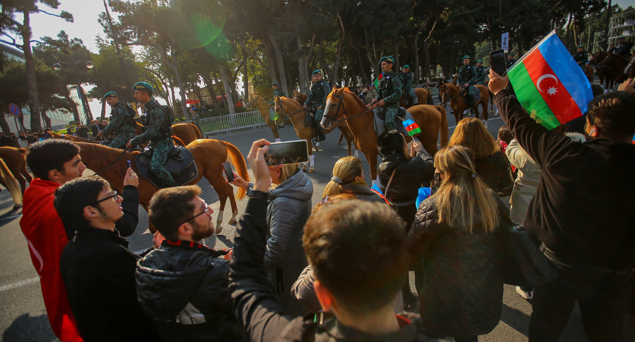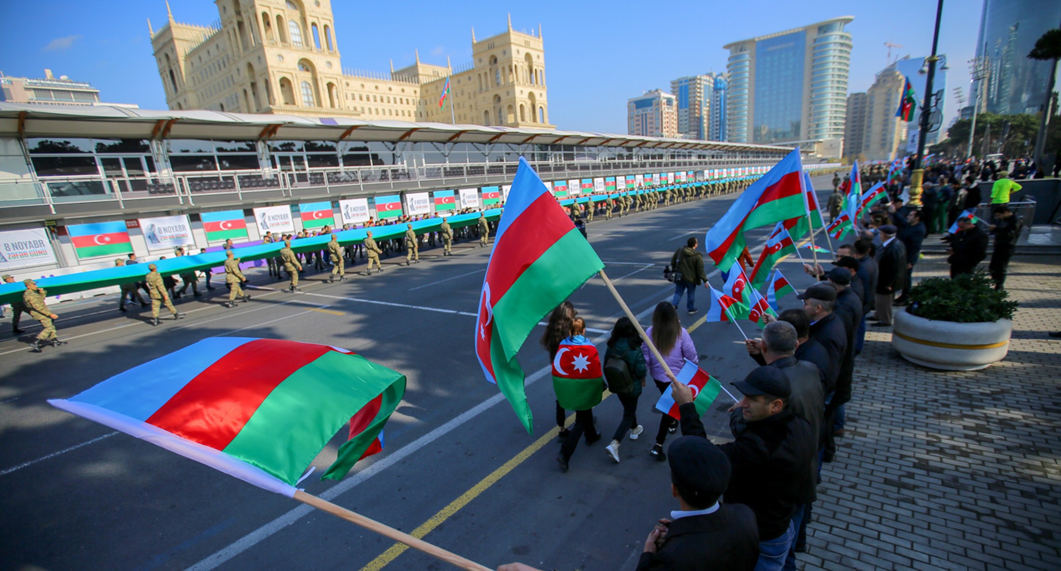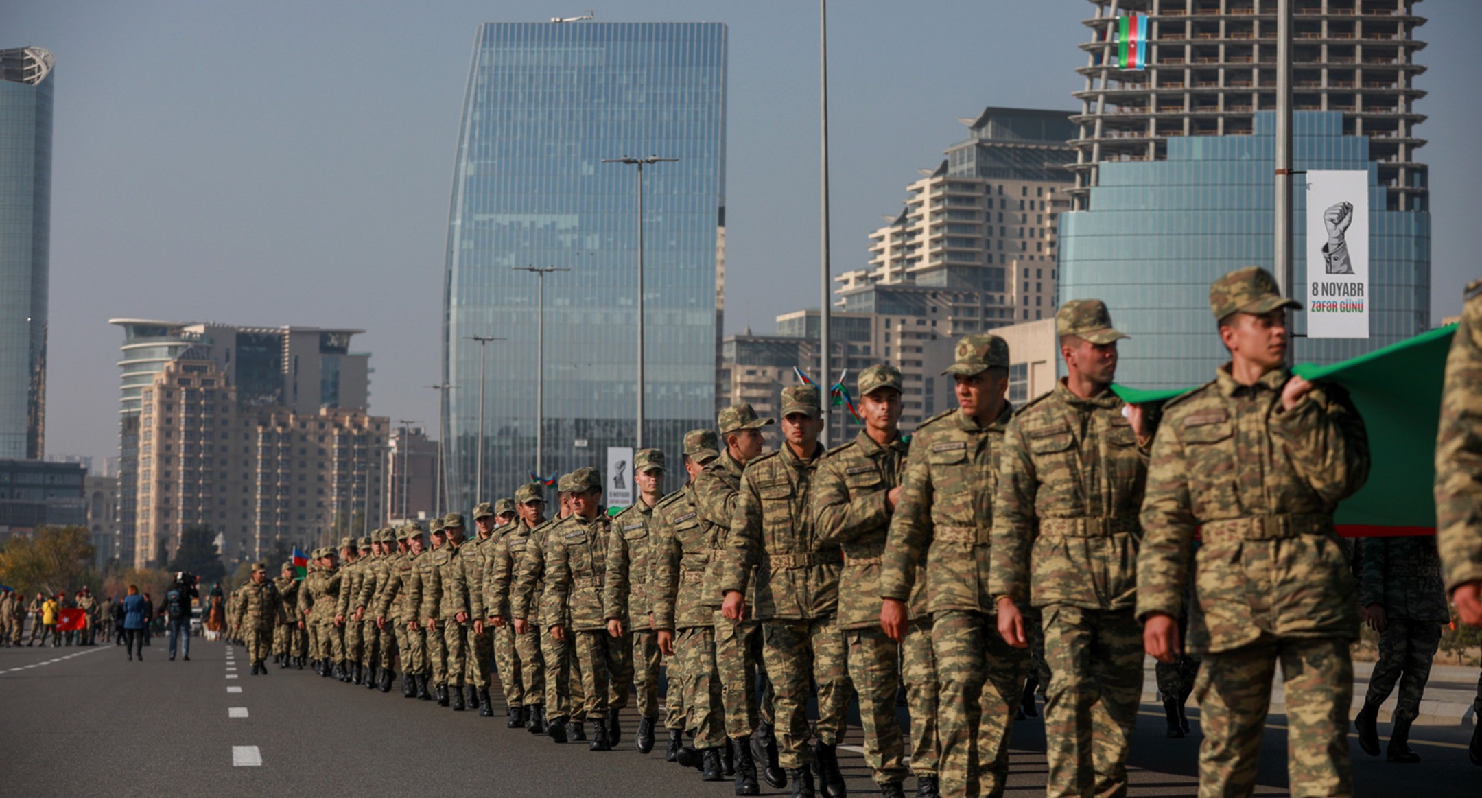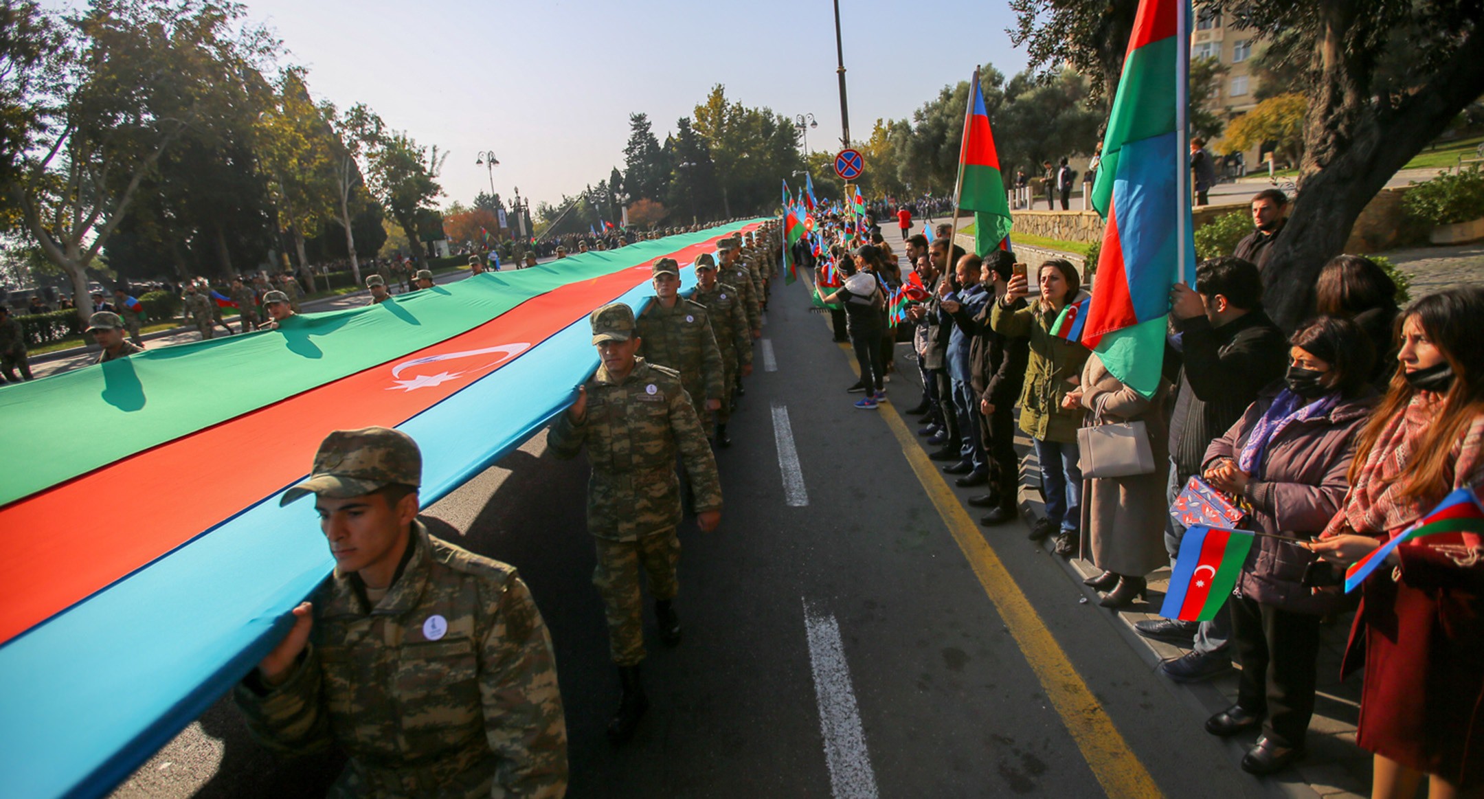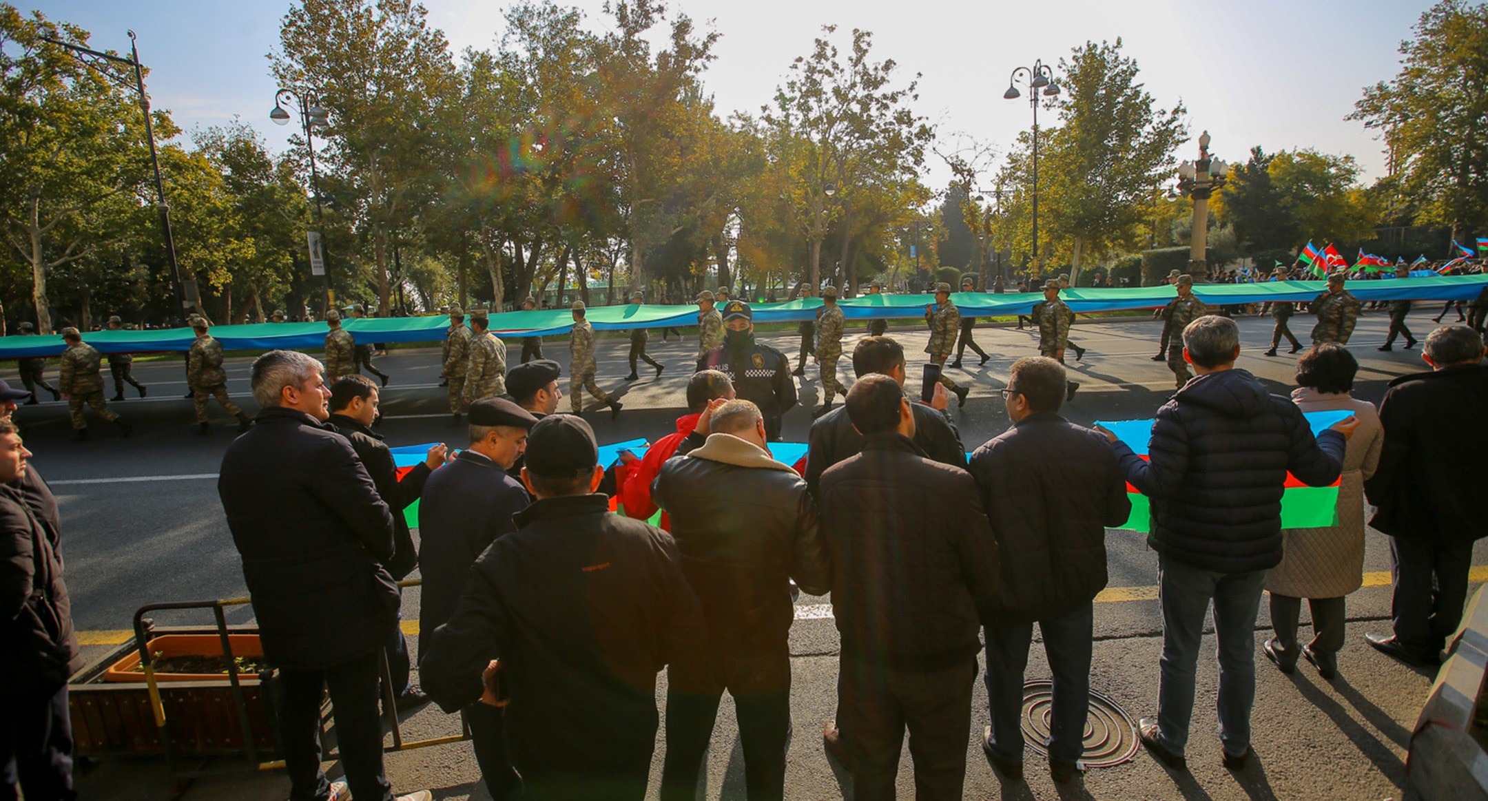Шествие в честь Дня победы Азербайджана в 44-дневной осенней войне 2020 года состоялось в Баку. Военная кампания, в ходе которой погибли более 2900 азербайджанских военных, завершилась 9 ноября, но праздник отмечается 8 ноября – в день, когда Азербайджан взял под контроль Шушу. Для семей погибших жителей Армении, Нагорного Карабаха и Азербайджана это траурный день.