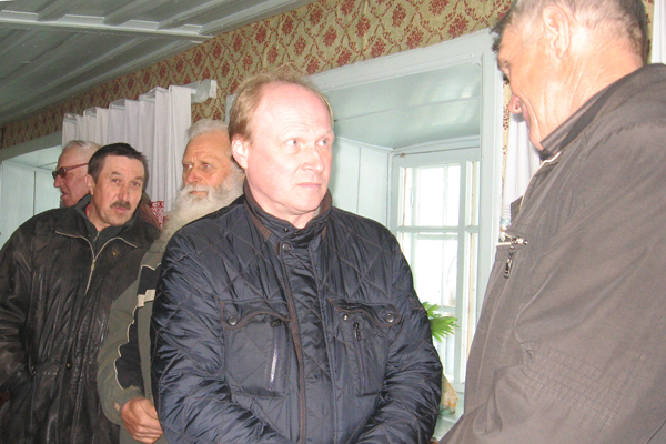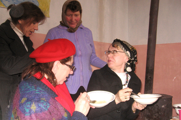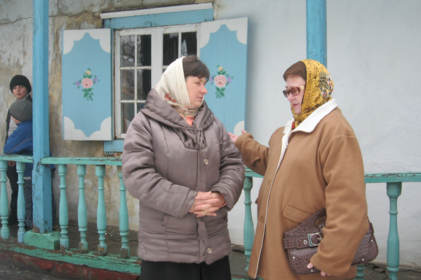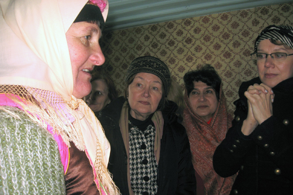 Групповое моление духоборцев в молельне «Сиротский дом». Во время молебна духоборцы сидят на деревянных лавочках, под расшитыми льняными полотенцами – «утирками». Село Гореловка Ниноцминдского района Грузии.