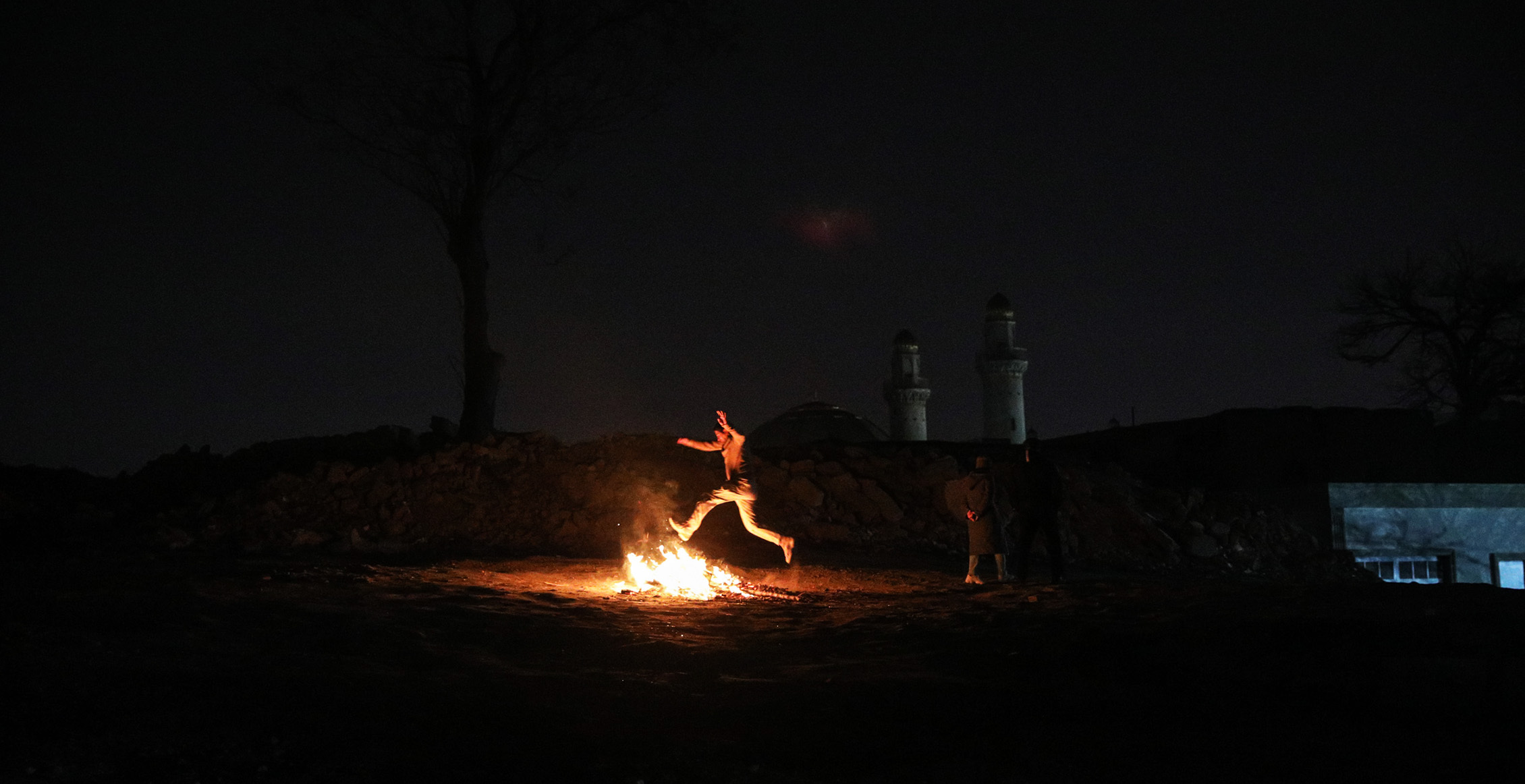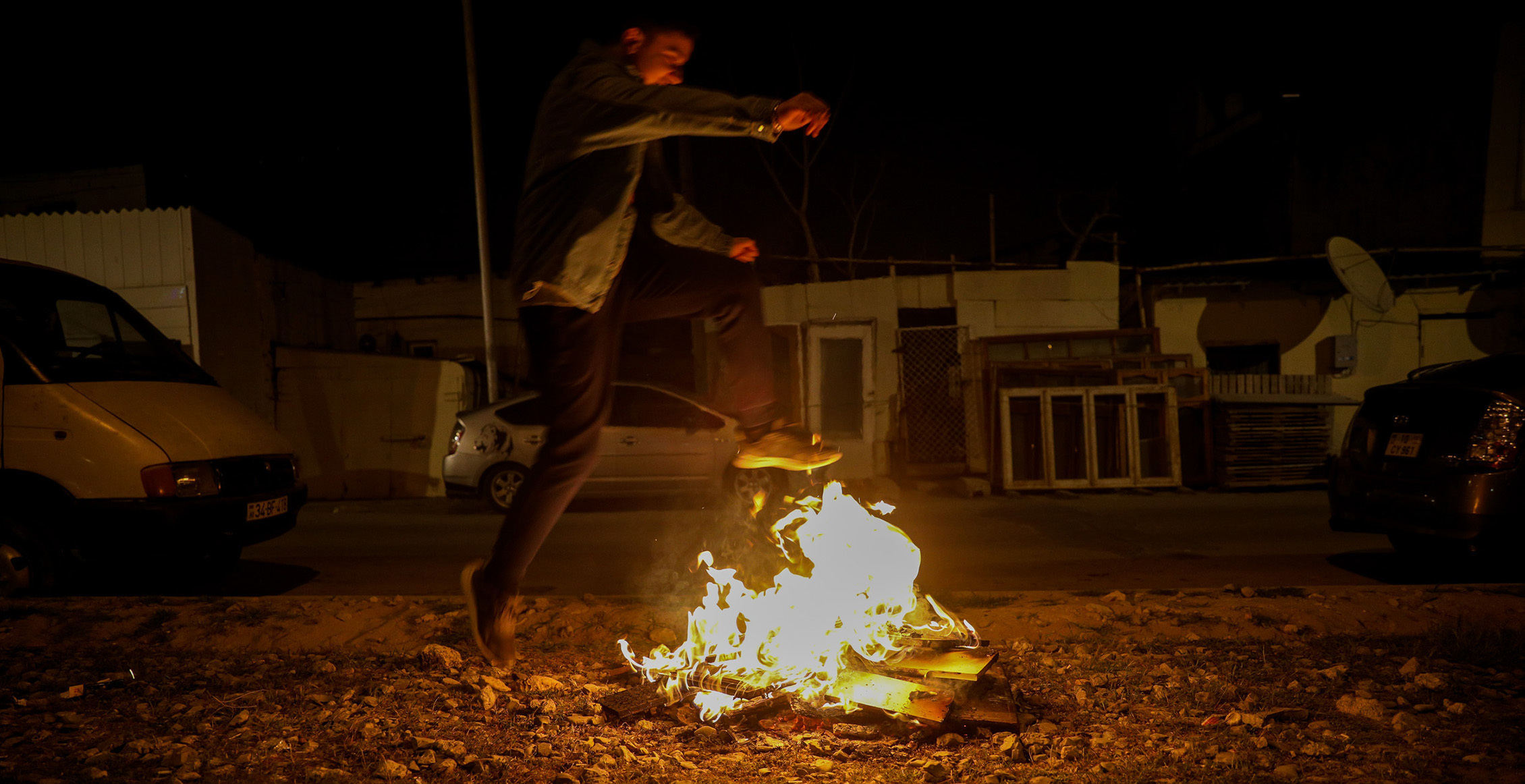 Молодой человек прыгает через костер
