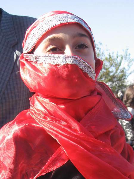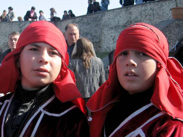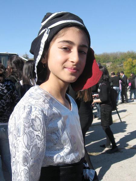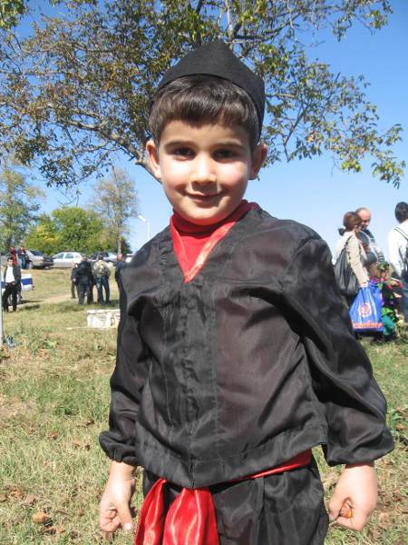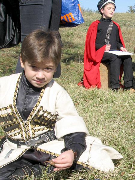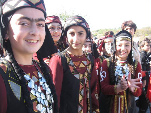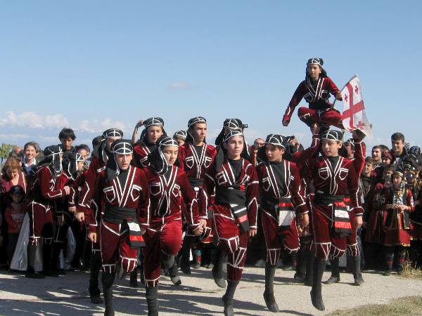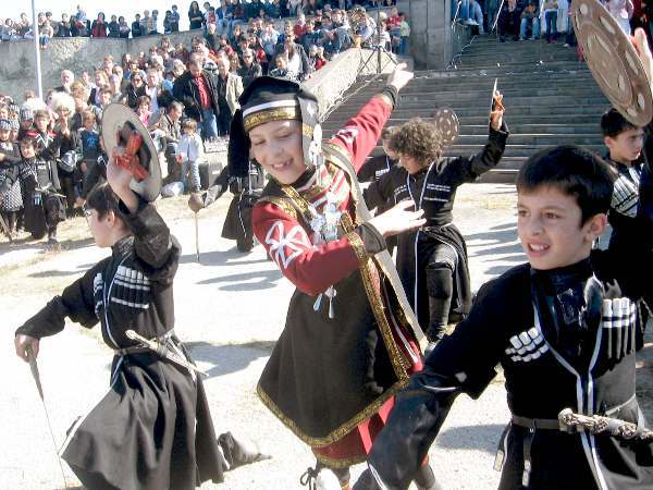Дети, одетые в национальные костюмы, встречают гостей праздника во дворе дома-музея Пиросмани
