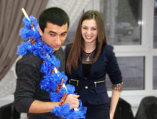 Студент из Сирии Умаф Мешвез, ведущий игры, держит жезл под названием " дэжые бэщ", "палка с фундуком" по-адыгейски.