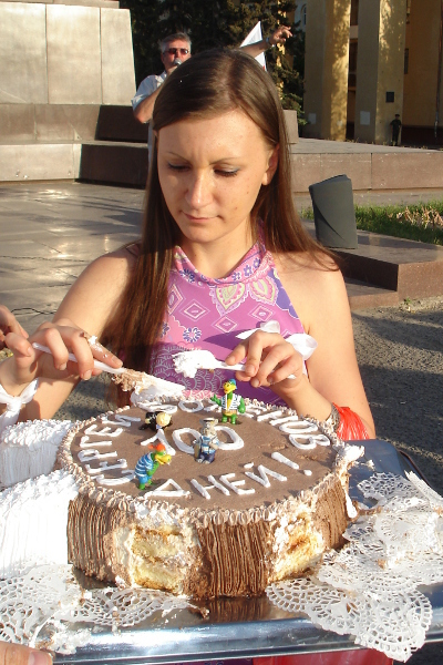 Координатор общественного движения «Лига избирателей» Алевтина Дюпри раздает митингующим торт с надписью " Сергей Боженов - сто дней".