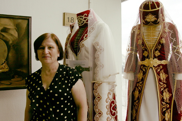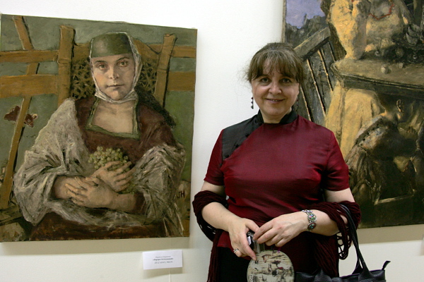 Фатима Соскиева, мастер по батику и гобелену, у своего портрета кисти Ларисы Наумовой.