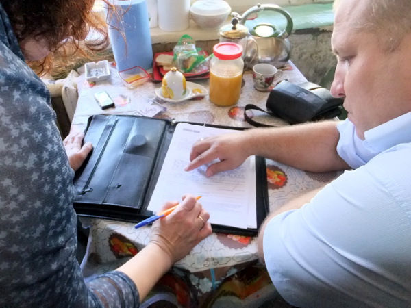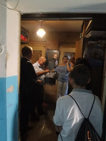 Семьи Шабло, Сердюковой и Стреляевой в ожидании приставов в коридоре квартире. Слева направо: Константин, Максим и Елена Шабло, бабушка мальчика Наталья Сердюкова, прабабушка мальчика Вера Стреляева.