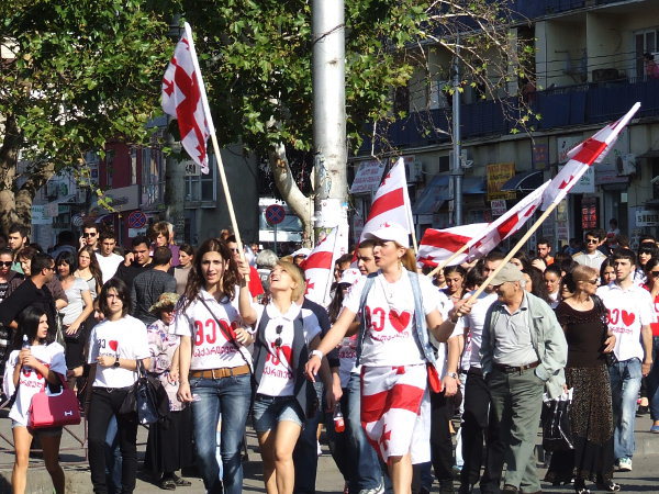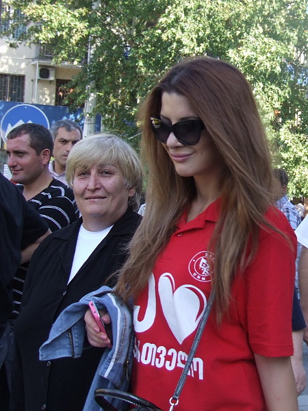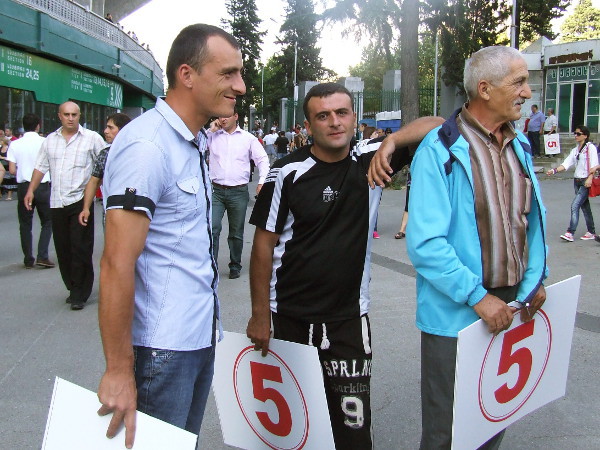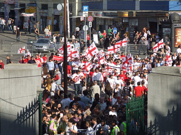 Уже к 15.00 к стадиону начали приходить люди в футболках и кепках с надписью "Я люблю Грузию" и "5".