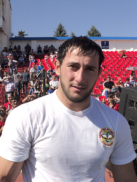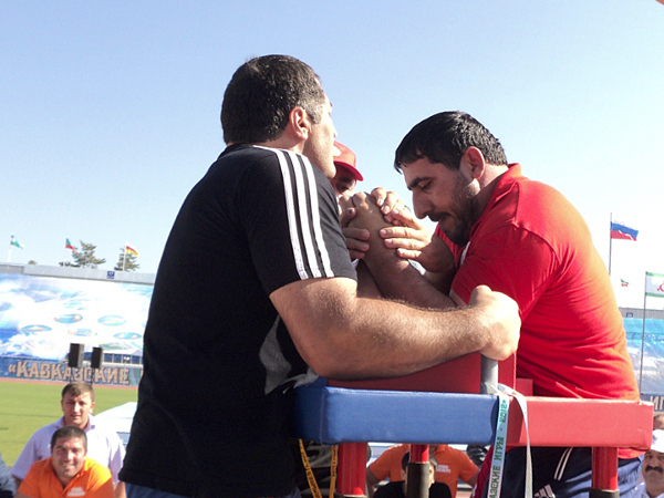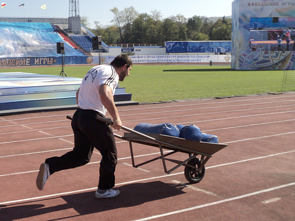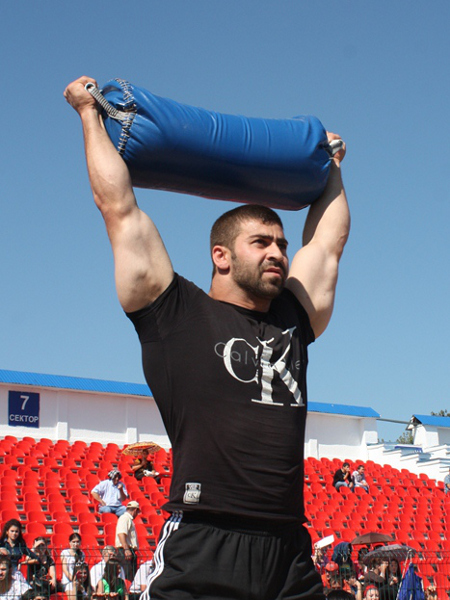 Мешок в песком веслом в 50 кг поднимает спортсмен из Чечни.