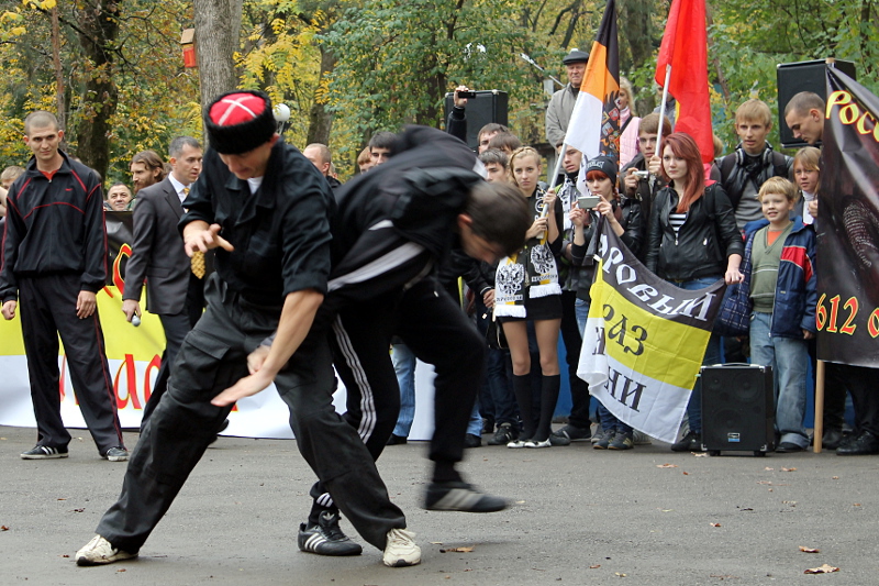 “Русский марш” прошел 4 ноября с 11.30 до 13.30 мск в Чистяковской роще Краснодара. По мнению организаторов, в нем приняли участие более 1500 человек. Участники марша развернули более десяти черно-желто-белых имперских флагов и красный флаг с коловратом, транспаранты “России – русскую власть!”, “Хватит врать!”, “Здоровый образ жизни”. Среди участников были члены Кубанского казачьего войска, люди в форме членов казачьих дружин, а также казаки нереестровых войск, футбольные фанаты, активисты “Яблока”, православные верующие с иконами и родноверы с коловратами.