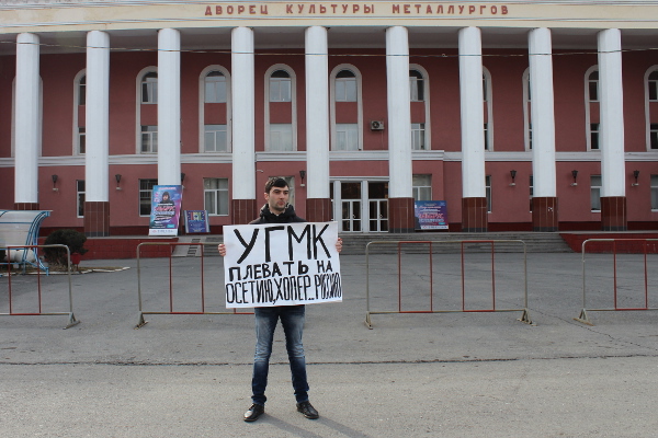 Во Владикавказе прошли два одиночных пикета против деятельности металлургического предприятия “Электроцинк”. Пикеты провели санитарный врач Ацамаз Хадиков и местный житель Алан Аликов. Пикеты были организованы в поддержку жителей Воронежа, выступающих против добычи никеля Уральской Горно-металлургической компанией (УГМК), дочерним предприятием которой является завод “Электроцинк”.