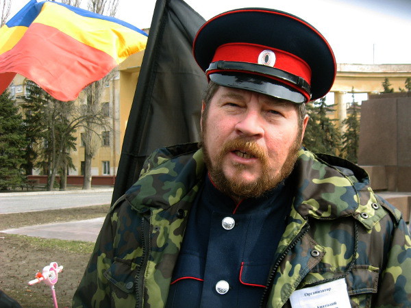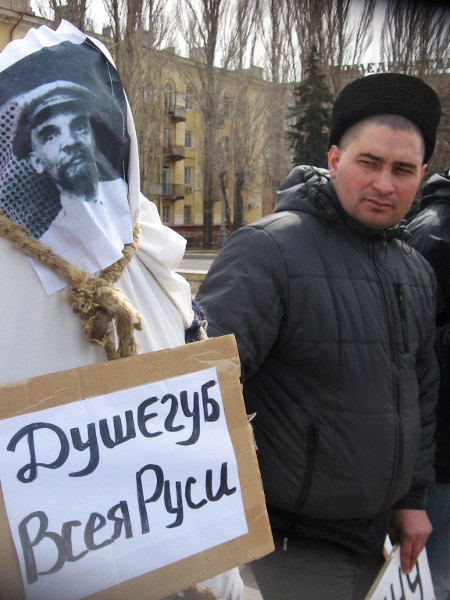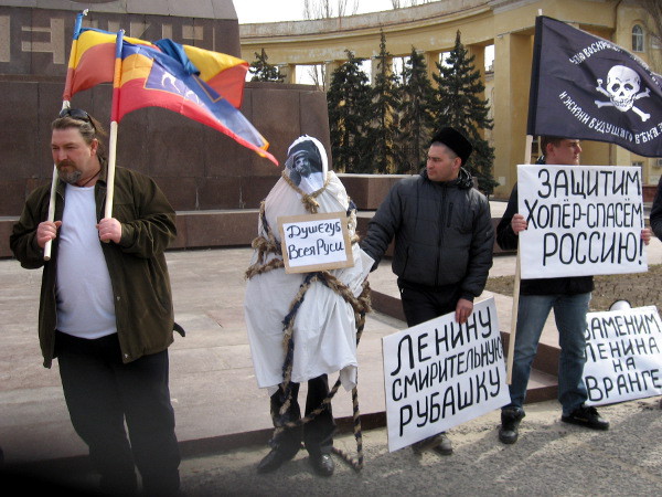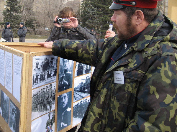 Участники митинга - казаки Отдельного особого казачьего войска и Царицынского округа донских казаков - демонстрировали антиленинские плакаты.